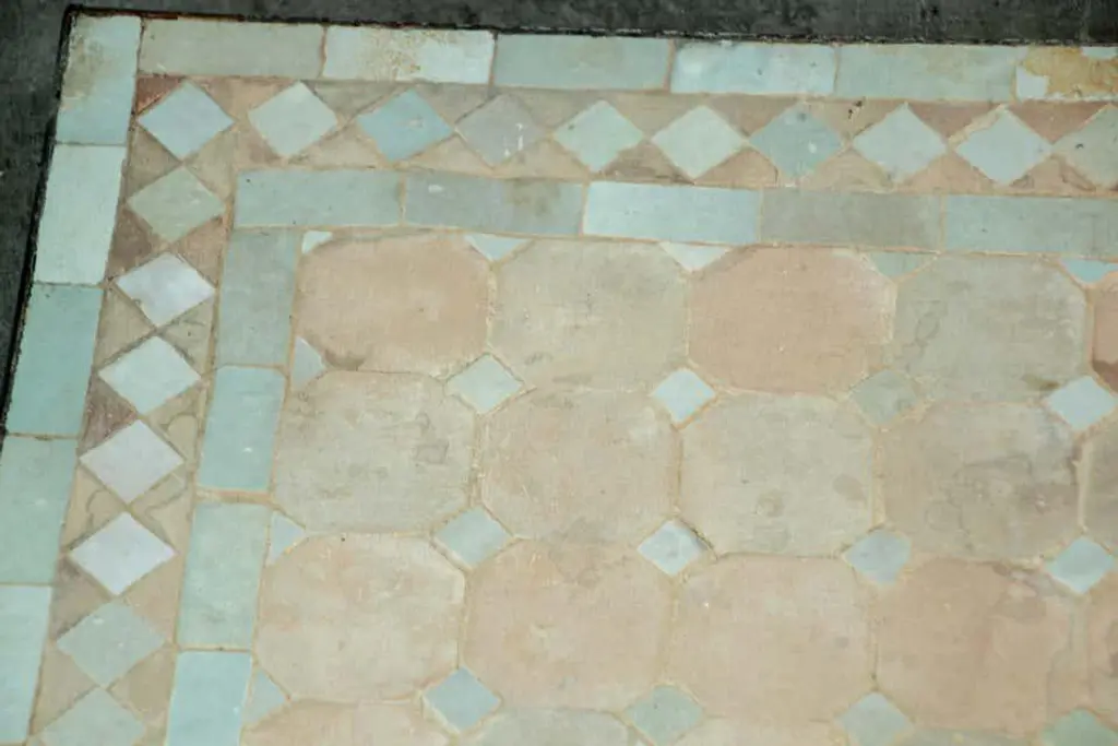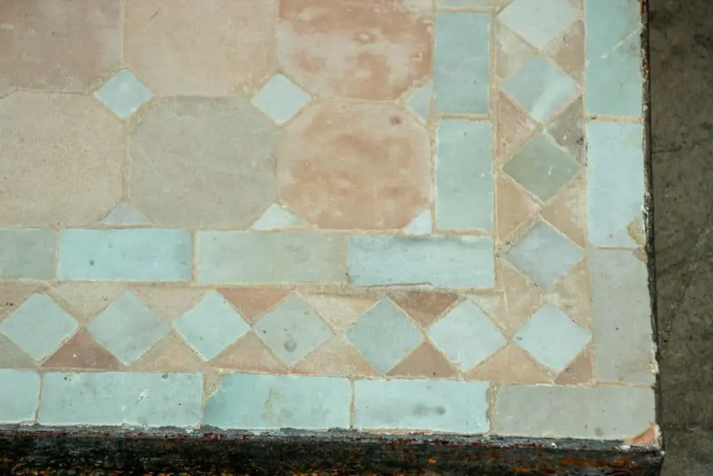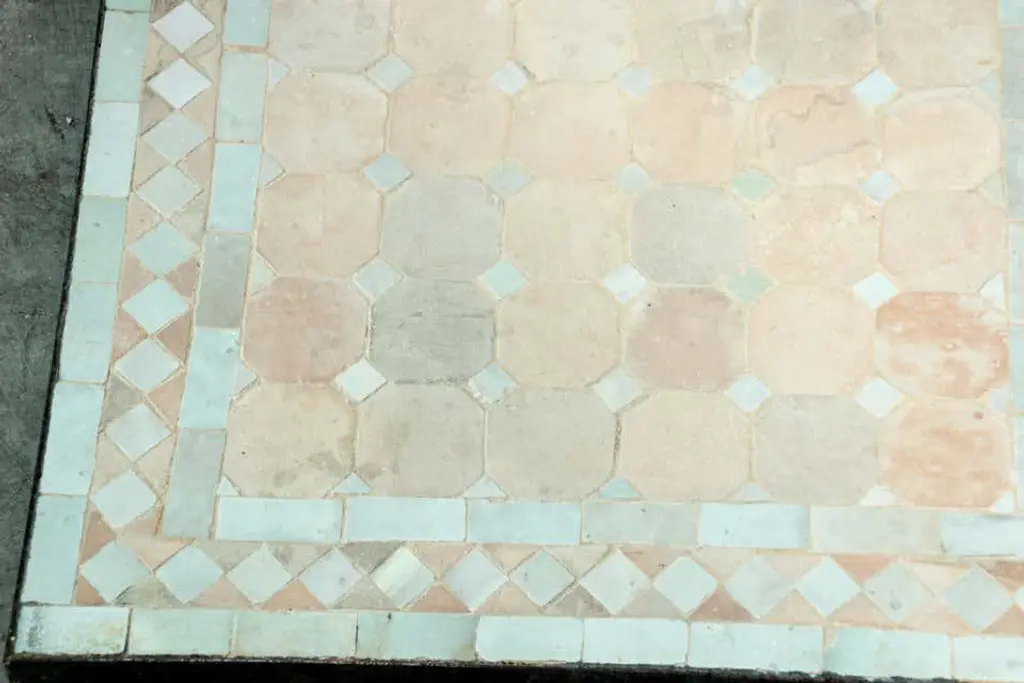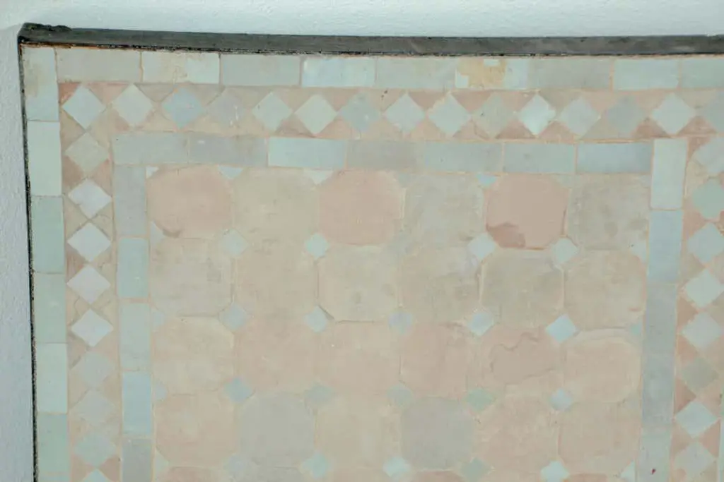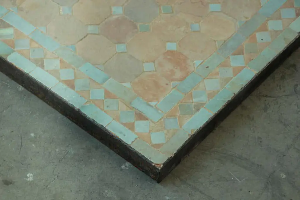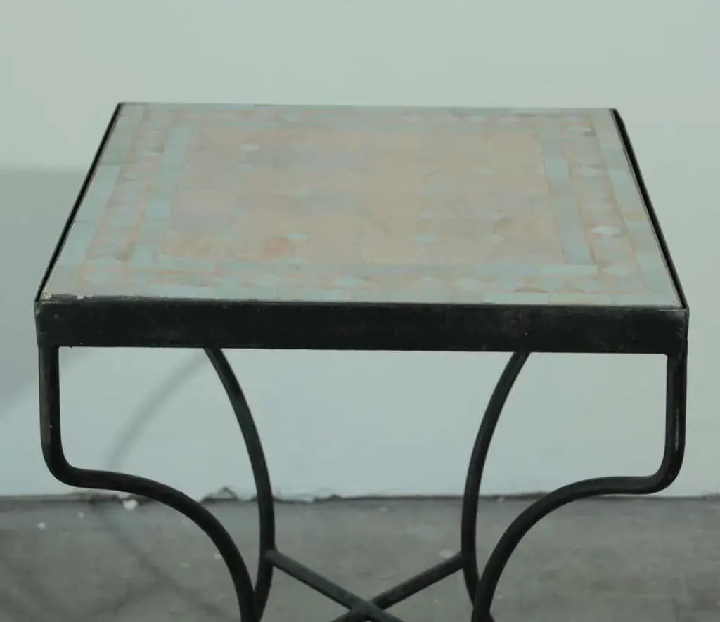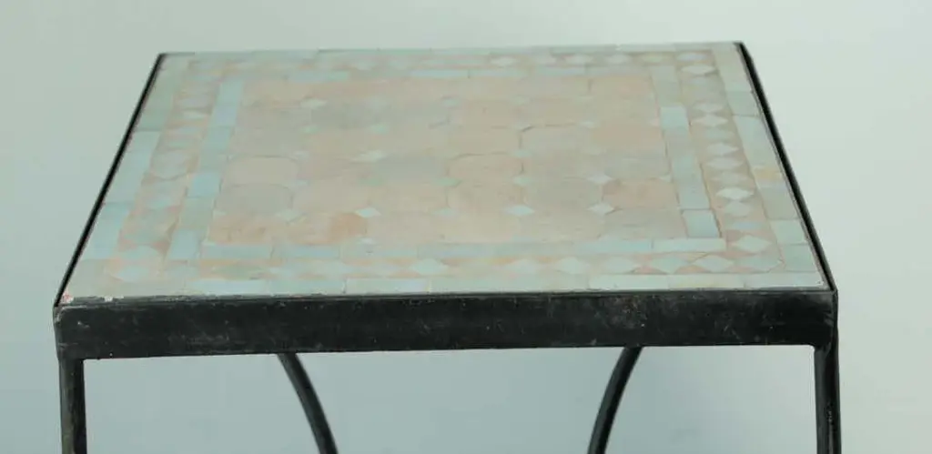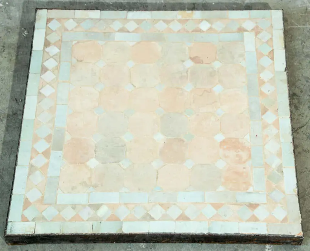 Indoor and outdoor Moroccan tile table, use it in the kitchen or in your garden, the base and top have been sealed for easy care. Hand crafted Moroccan mosaic tile table. Reclaimed ivory glazed tiles and tan colors. 18" x 18" square x 29" height.