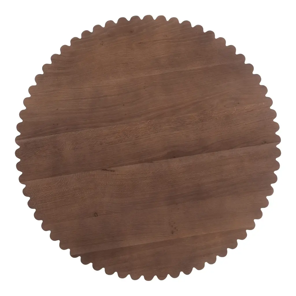 The wave detailing on the Nomi cafe table is a visual highlight, an expression of the thoughtfulness and attention to detail that went into its design, adding a sense of dynamic movement. The repetition of the wave pattern creates an inviting rhythm, providing a memorable visual experience along with a brass base, nodding to vintage design while maintaining a contemporary refinement, together conveying a sense of future heirloom quality.