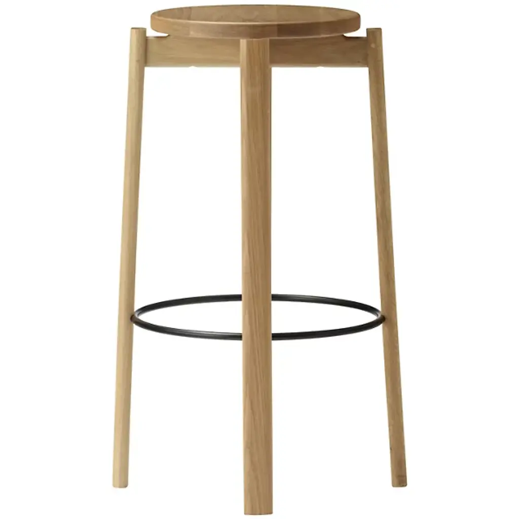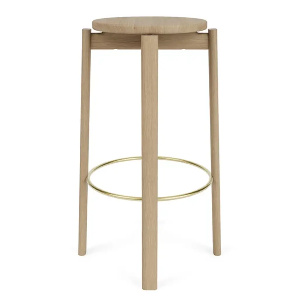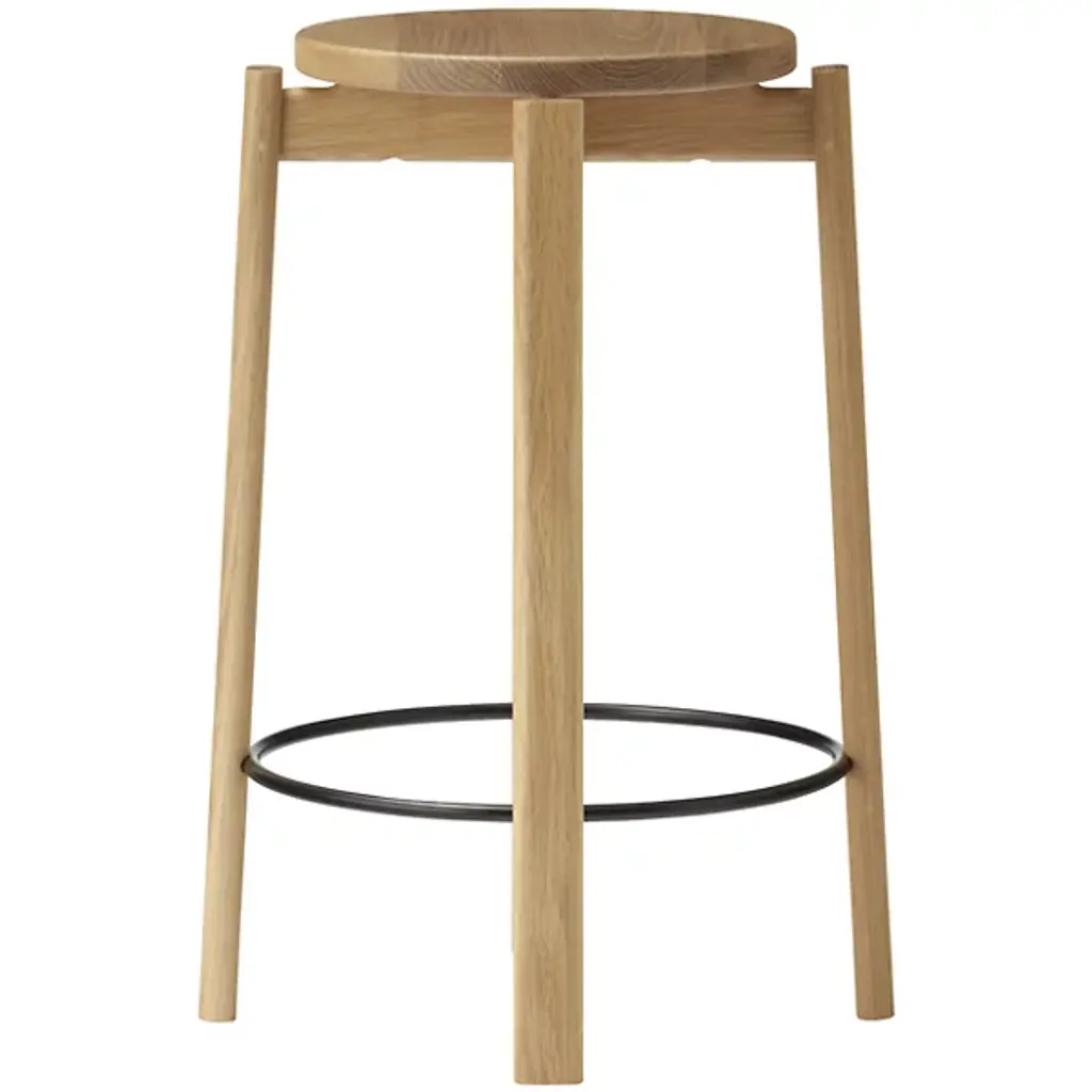 Make a tasteful, appealing addition to inside spaces with the Passage Bar / Counter Stool from Audo Copenhagen, formerly known as Menu. This stool blends contemporary and Scandinavian styles. A strong offering ideal for breakfast bars and café tables, it ascends along four legs of solid oak, sourced from responsibly managed forests, converging in a cross structure above. A slim steel hoop keeps the legs together, providing a refined contrast with the natural warmth of the wood, while a sleek disc seat sits atop the cross-convergence of the legs and provides steady comfort.