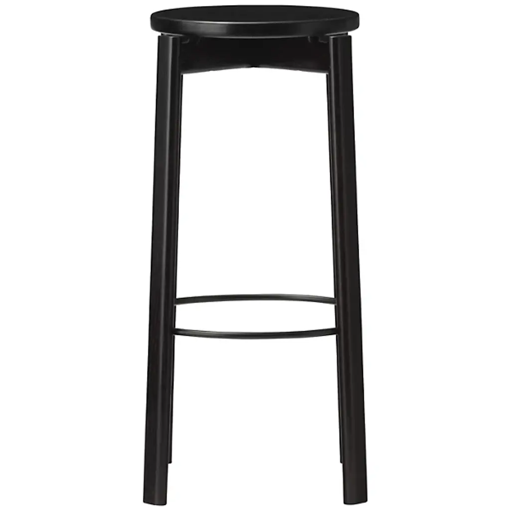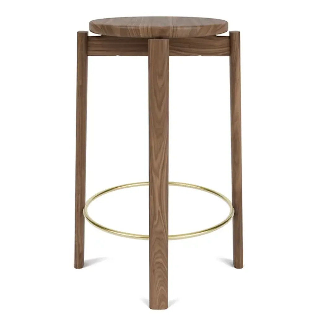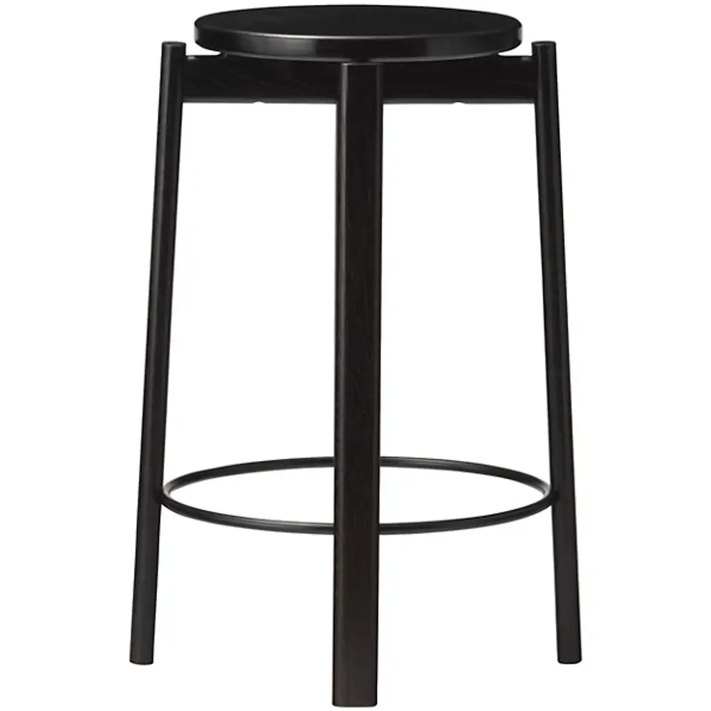Make a tasteful, appealing addition to inside spaces with the Passage Bar / Counter Stool from Audo Copenhagen, formerly known as Menu. This stool blends contemporary and Scandinavian styles. A strong offering ideal for breakfast bars and café tables, it ascends along four legs of solid oak, sourced from responsibly managed forests, converging in a cross structure above. A slim steel hoop keeps the legs together, providing a refined contrast with the natural warmth of the wood, while a sleek disc seat sits atop the cross-convergence of the legs and provides steady comfort.