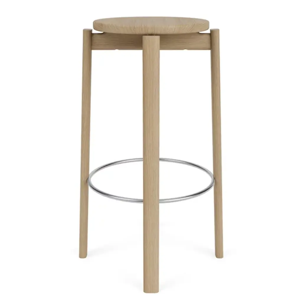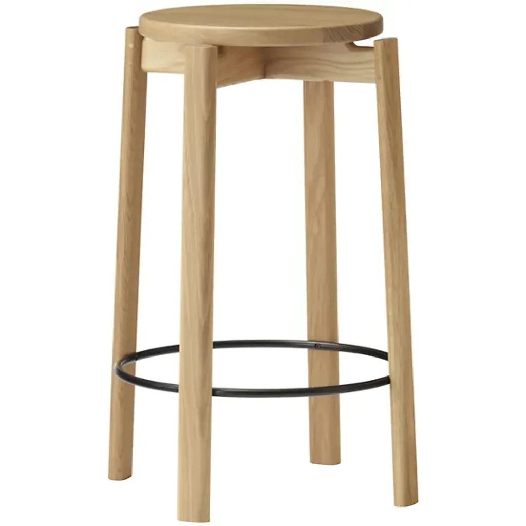 Make a tasteful, appealing addition to inside spaces with the Passage Bar / Counter Stool from Audo Copenhagen, formerly known as Menu. This stool blends contemporary and Scandinavian styles. A strong offering ideal for breakfast bars and café tables, it ascends along four legs of solid oak, sourced from responsibly managed forests, converging in a cross structure above. A slim steel hoop keeps the legs together, providing a refined contrast with the natural warmth of the wood, while a sleek disc seat sits atop the cross-convergence of the legs and provides steady comfort.