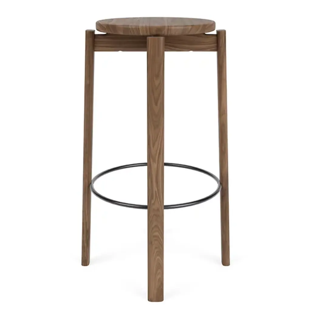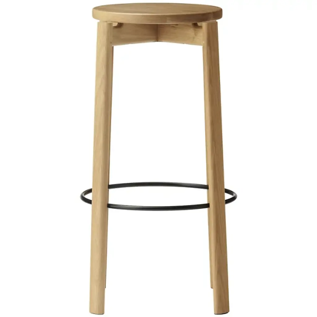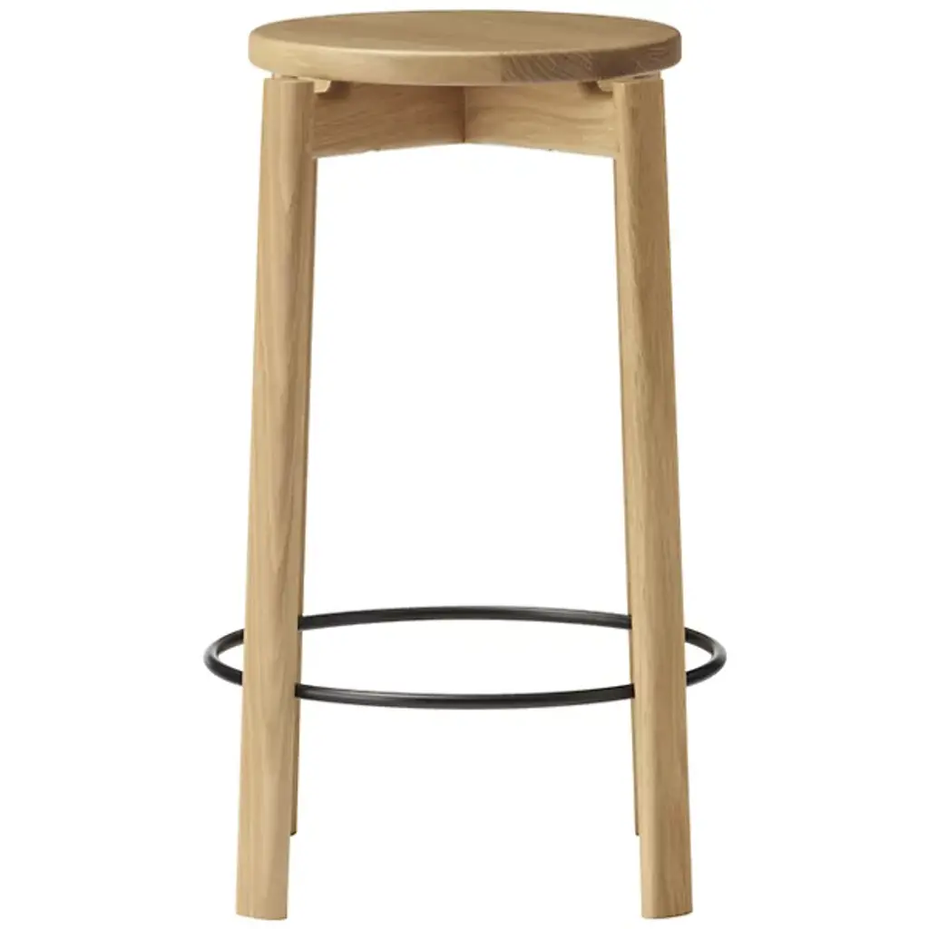 Make a tasteful, appealing addition to inside spaces with the Passage Bar / Counter Stool from Audo Copenhagen, formerly known as Menu. This stool blends contemporary and Scandinavian styles. A strong offering ideal for breakfast bars and café tables, it ascends along four legs of solid oak, sourced from responsibly managed forests, converging in a cross structure above. A slim steel hoop keeps the legs together, providing a refined contrast with the natural warmth of the wood, while a sleek disc seat sits atop the cross-convergence of the legs and provides steady comfort.