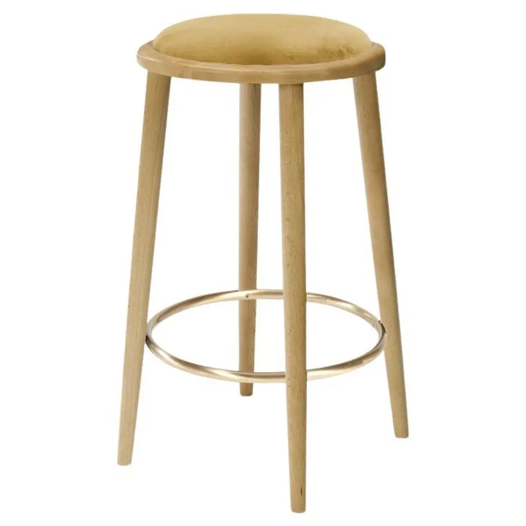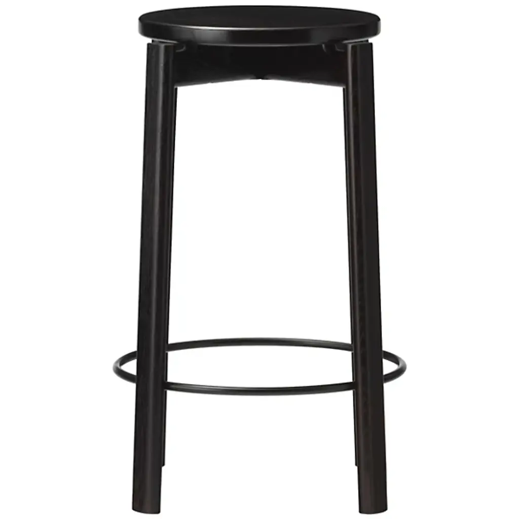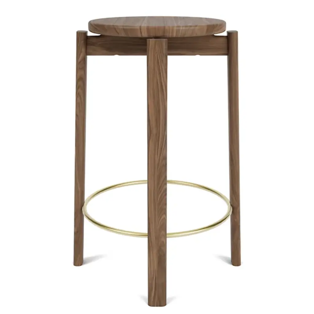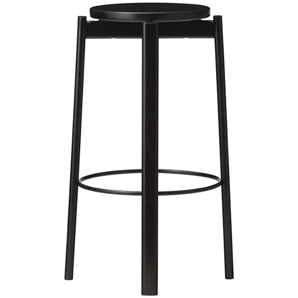 Make a tasteful, appealing addition to inside spaces with the Passage Bar / Counter Stool from Audo Copenhagen, formerly known as Menu. This stool blends contemporary and Scandinavian styles. A strong offering ideal for breakfast bars and café tables, it ascends along four legs of solid oak, sourced from responsibly managed forests, converging in a cross structure above. A slim steel hoop keeps the legs together, providing a refined contrast with the natural warmth of the wood, while a sleek disc seat sits atop the cross-convergence of the legs and provides steady comfort.