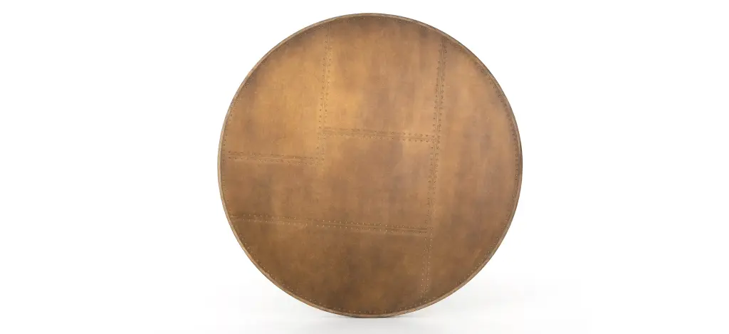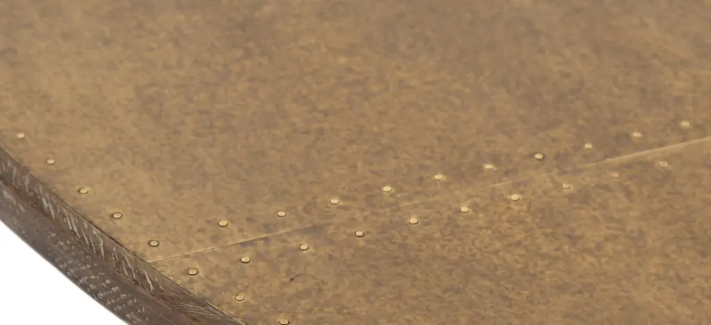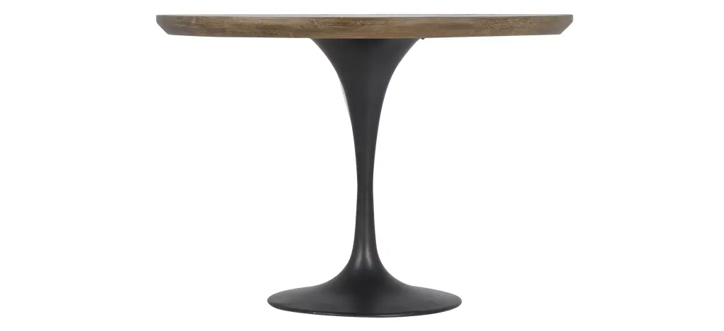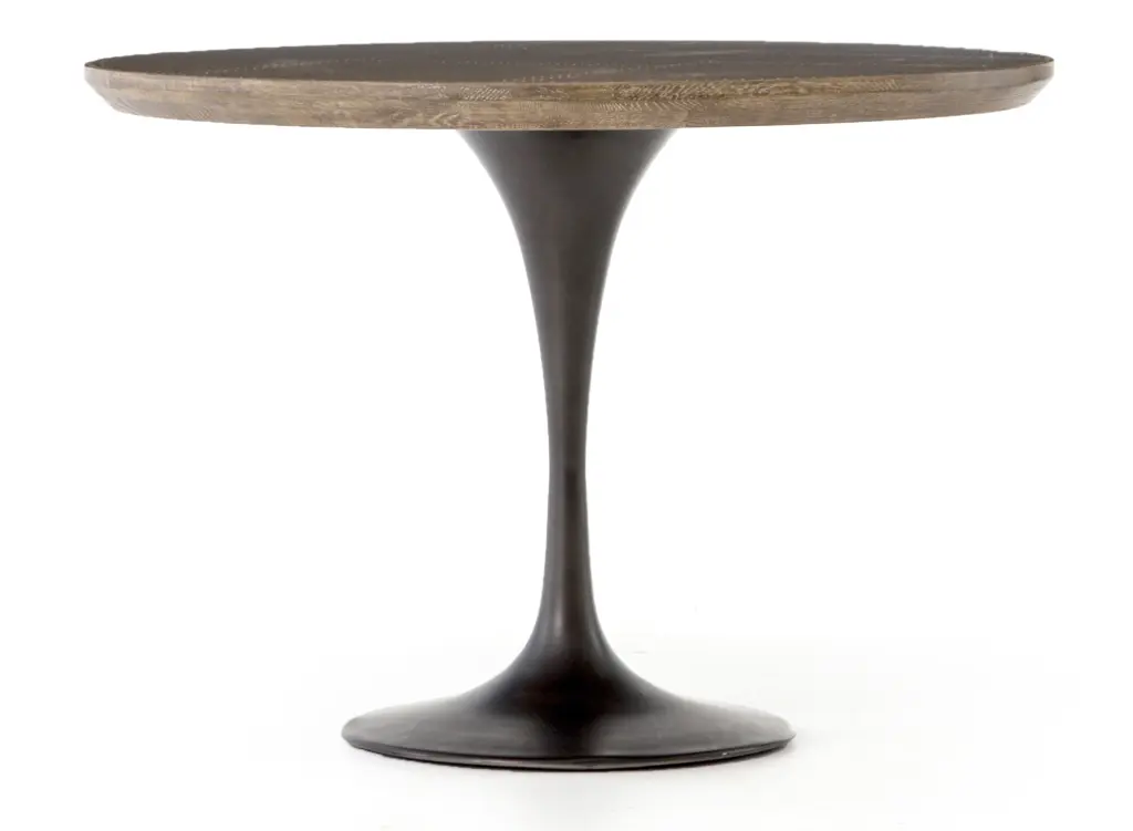Mixed materials make the table. Classic tulip shaping is recast with a deep black cast-iron base and a patchwork brass-clad top banded in distressed oak. Bistro sizing perfect for a cozy breakfast nook.
