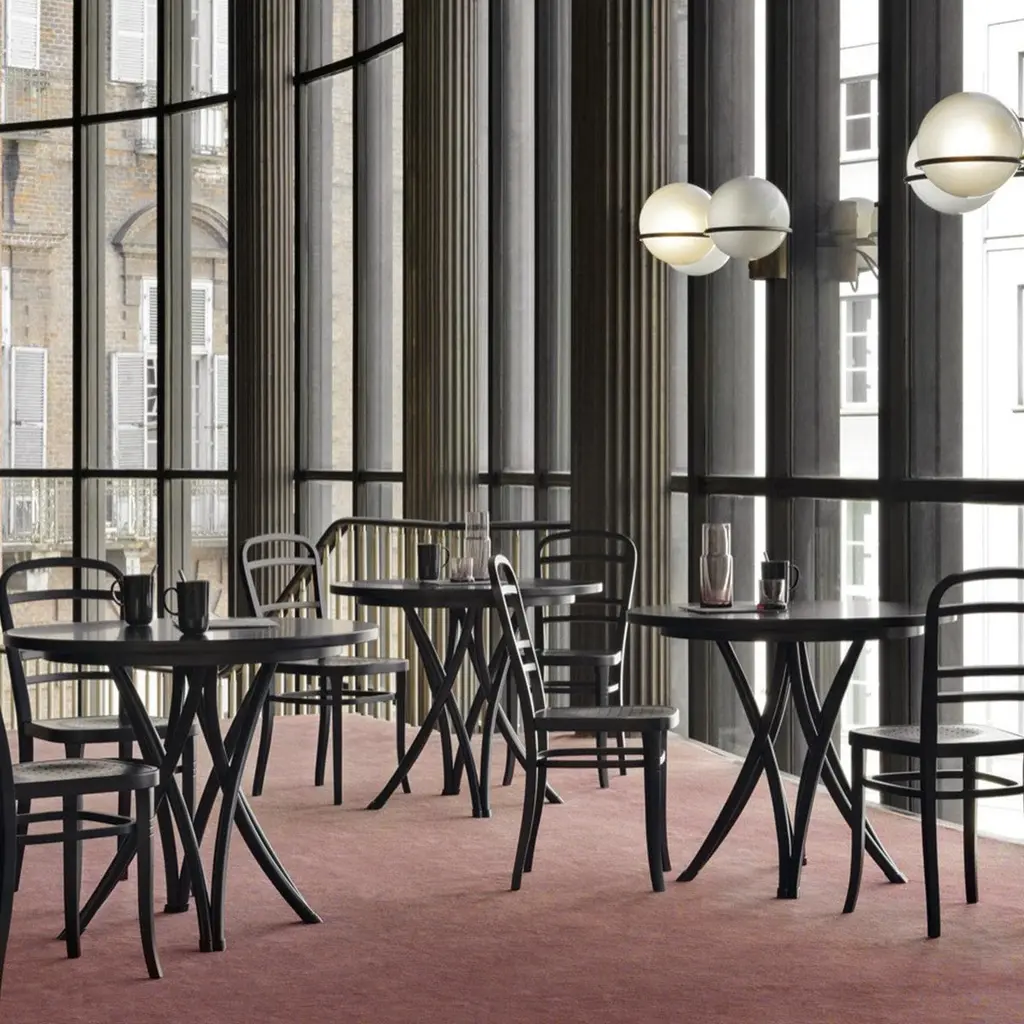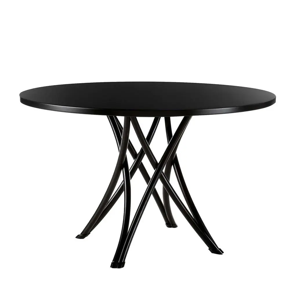 Part of the Rehbeintisch collection designed by Gebruder Thonet in 1888, this table combines a sense of lightness and movement in the elegant intersection of its slightly curved legs with a solid look that will add sophistication to any decor. The round top is in beechwood-veneered wood with a solid edge, while the standout element of the piece is its base, comprising four pairs of beechwood legs curved using the steaming technique developed by this brand since its inception. Plastic element protect the bottom of the feet.