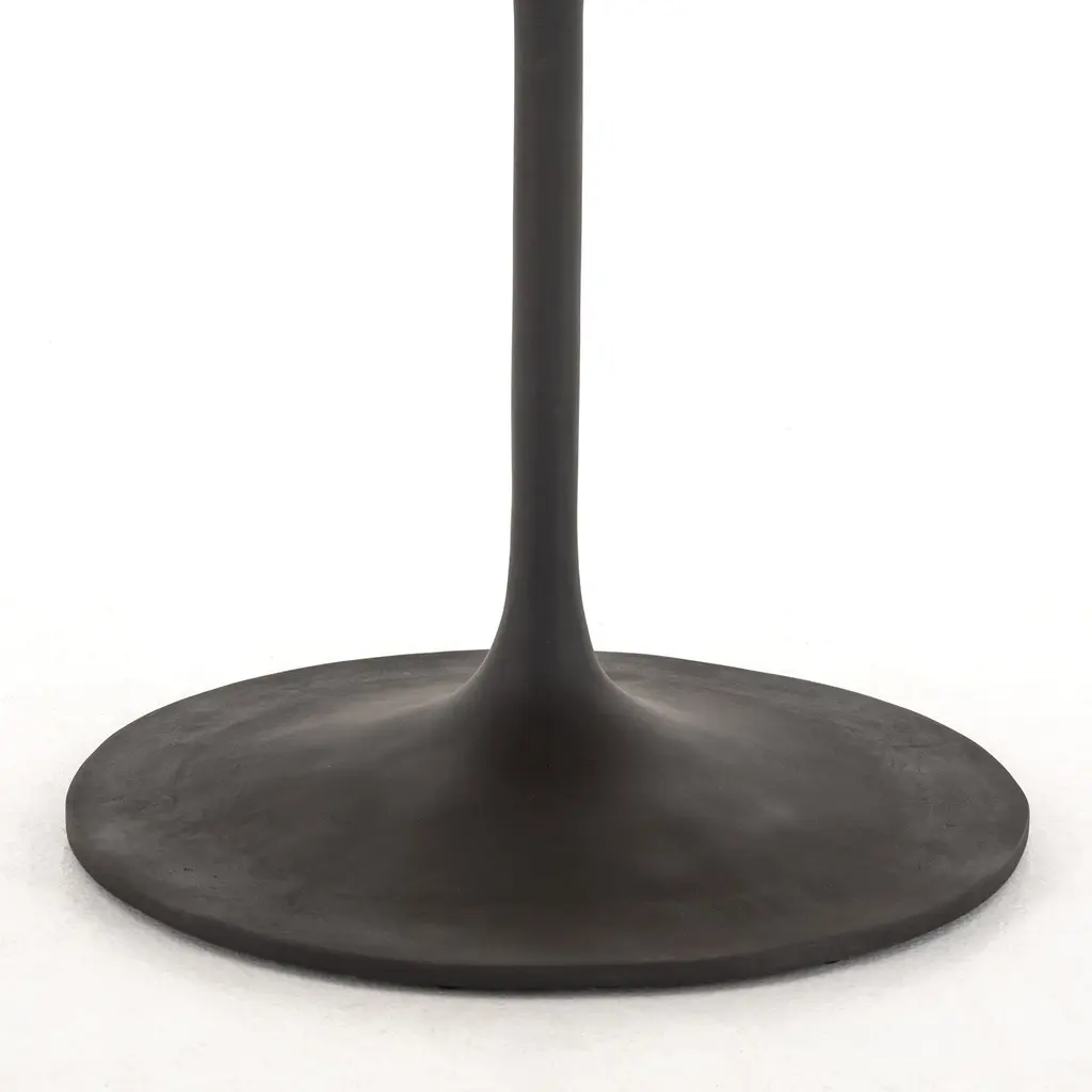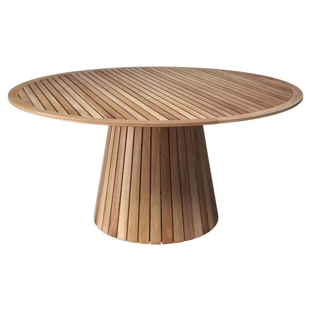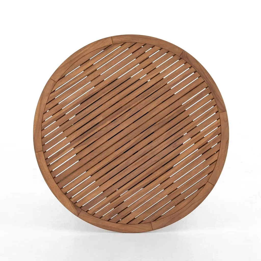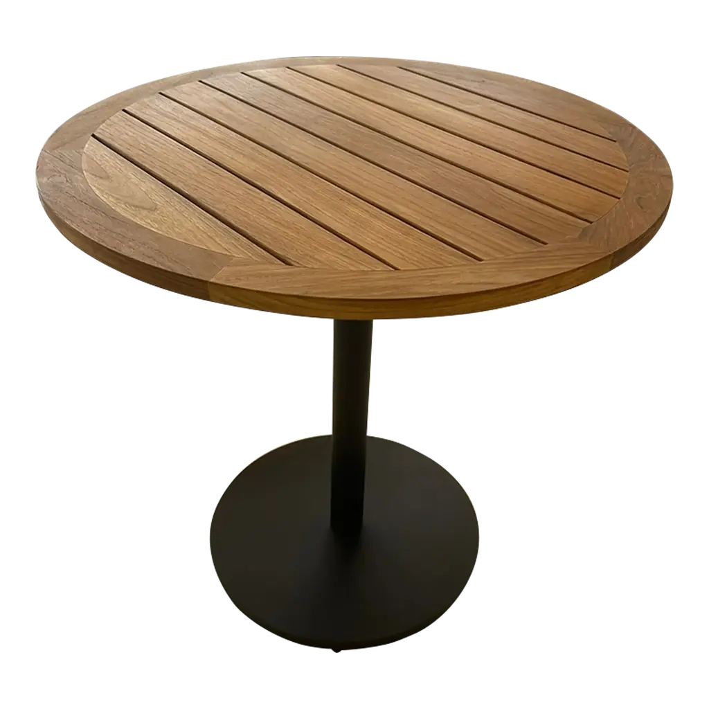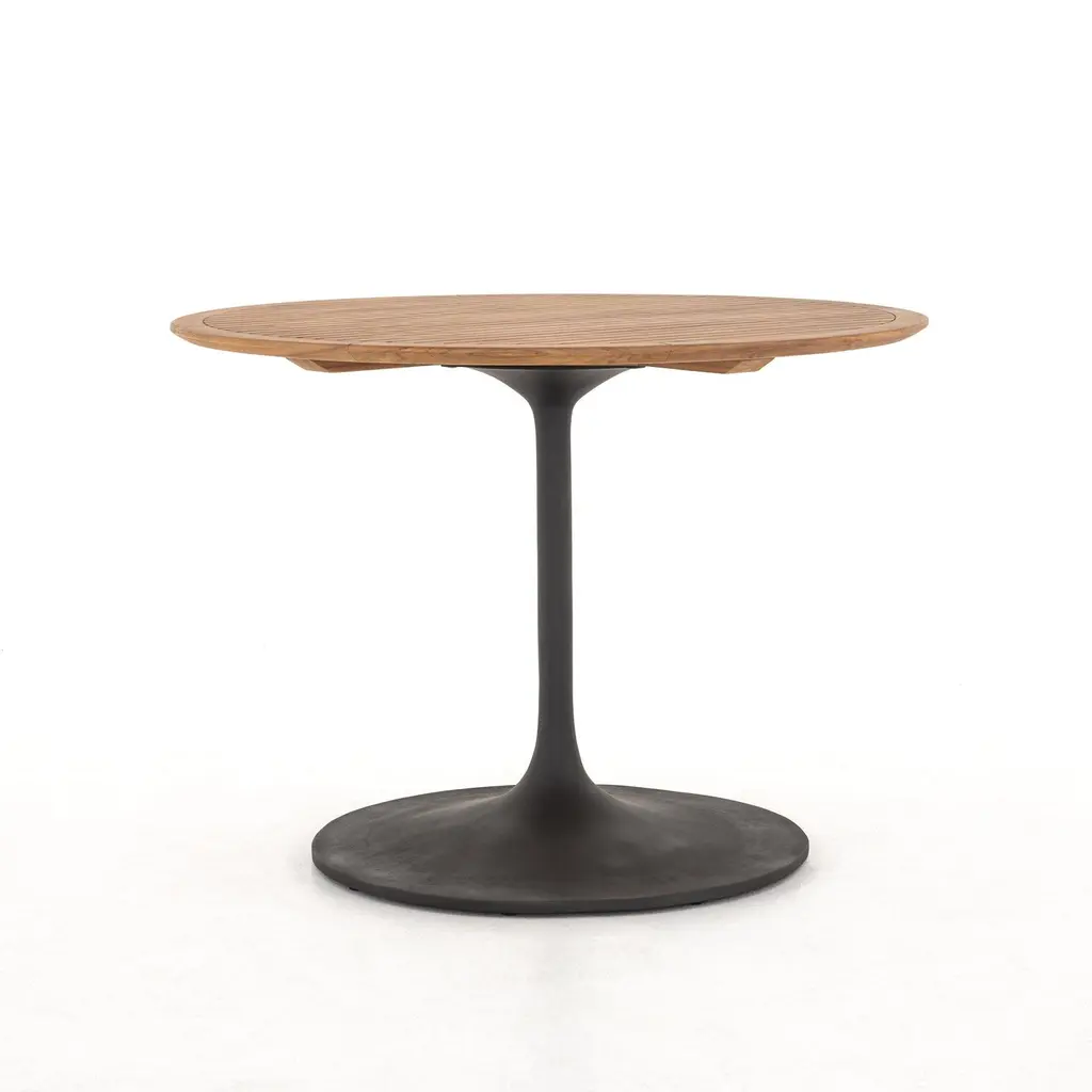Classic shaping and modern materials spur a smart bistro-scale dining style. A tulip base of bronzed aluminum supports a rounded tabletop of natural teak, with inset slats. Cover or store indoors during inclement weather and when not in use.