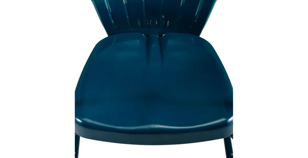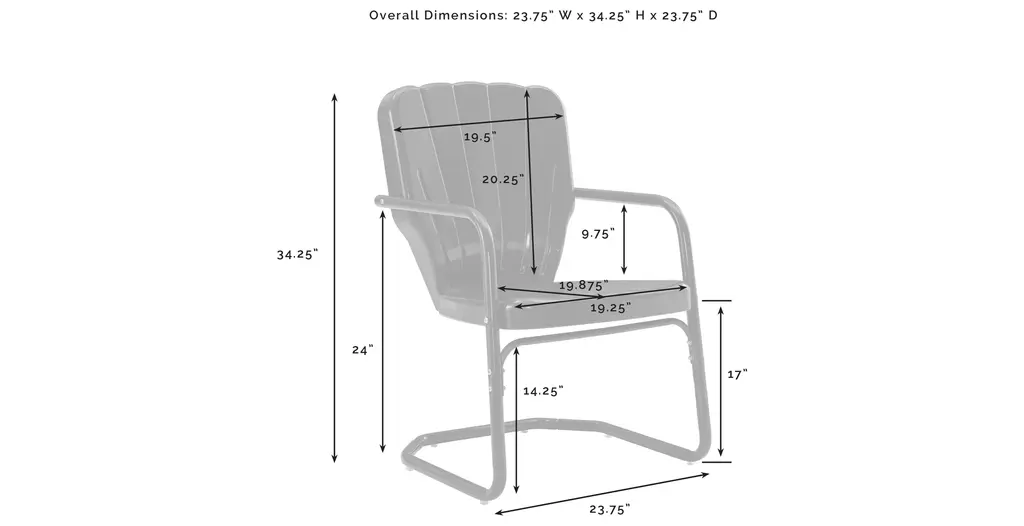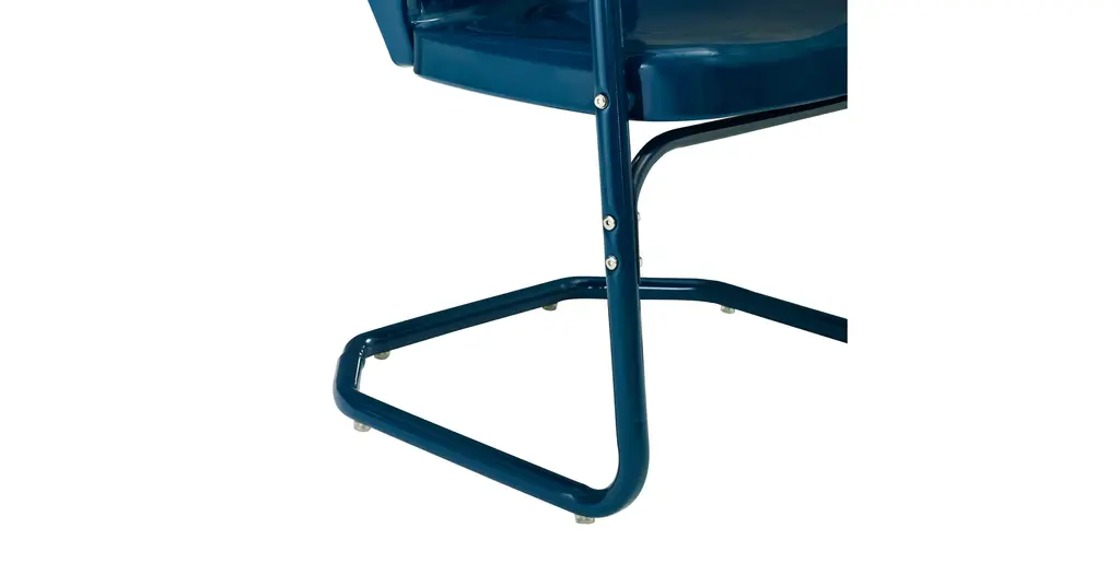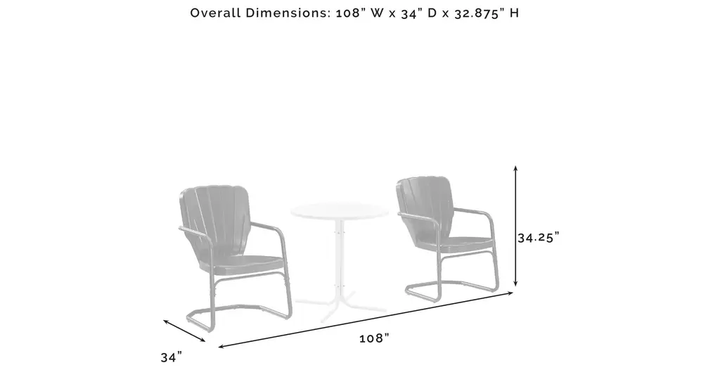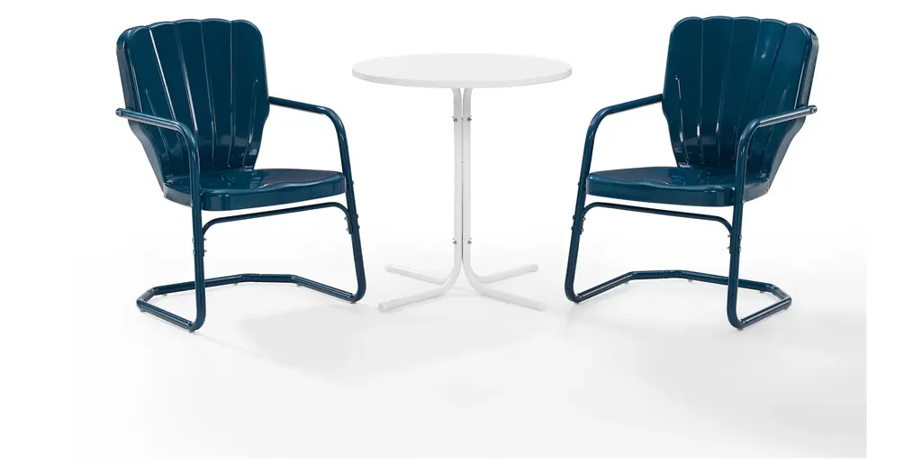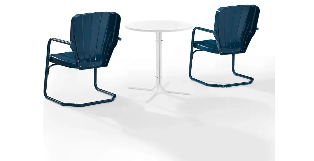 Inspired by the designs of yesteryear, the Ridgeland 3pc Bistro Set brings class and charm to your outdoor space. Two vintage-style chairs in vibrant colors surround a simple metal bistro table for a fun and functional outdoor lounging experience. Each chair features a clamshell back with decorative grooves, plus a cantilever base that provides just enough flex for lounging in comfort. The table's sturdy pedestal base is comprised of four metal legs and easily tucks between the chairs, making the Ridgeland 3pc Bistro Set ideal for a small balcony or patio.Ridgeland 2Pc Outdoor Chair Set Dimensions: 34.25" H x 23.25" W x 19.38" DGriffith Outdoor Bistro Table Dimensions: 28.88" H x 27.88" W x 27.88" D