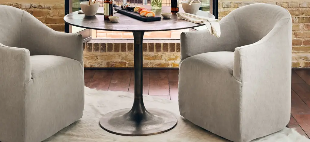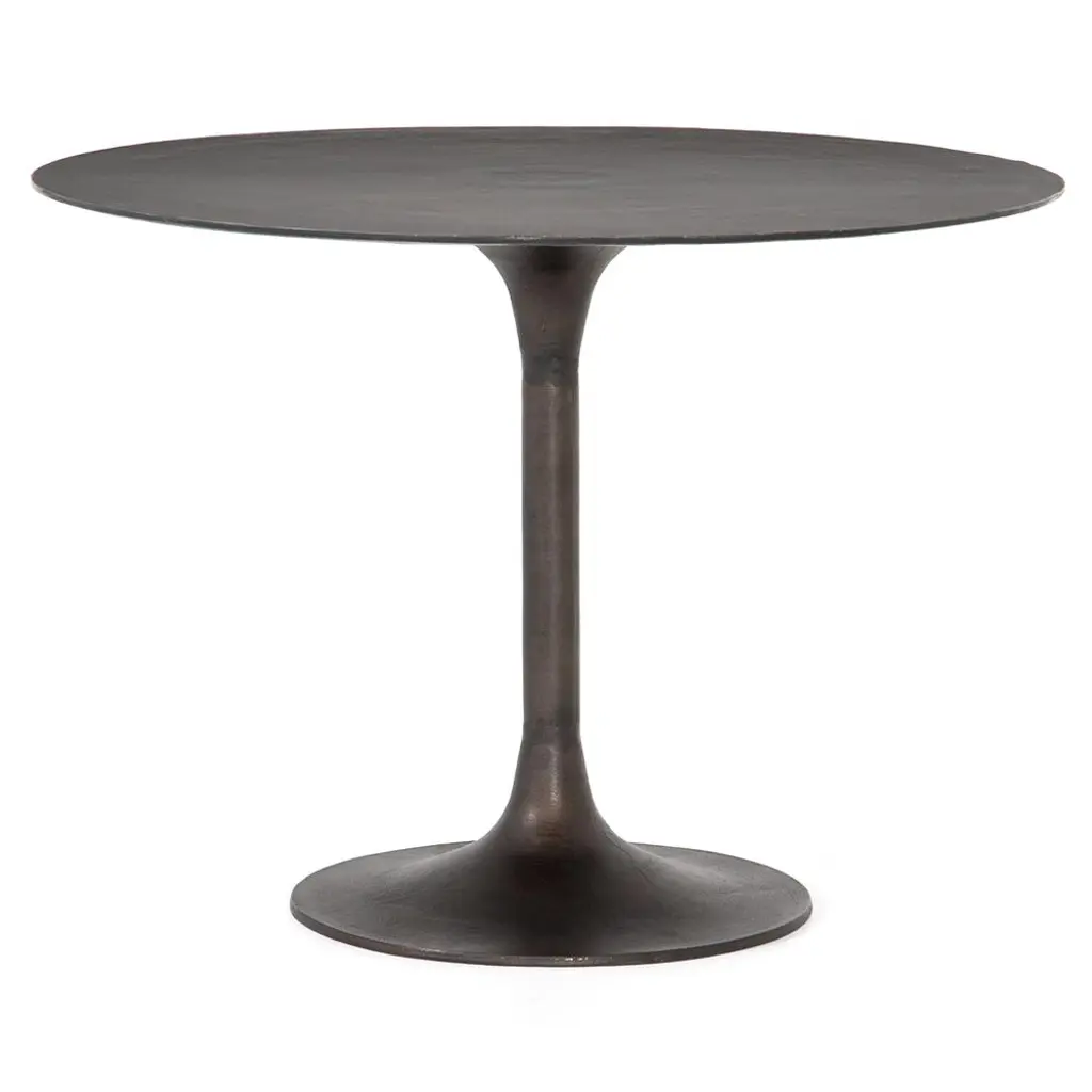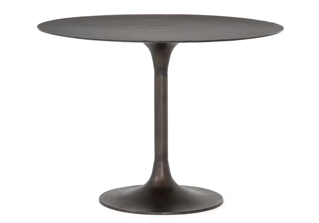Classic tulip shaping in textural cast-aluminum makes for a modern bistro table. Finished in antique rust to bring out alluring highs and lows. Great indoors or out cover or store indoors during inclement weather and when not in use.
