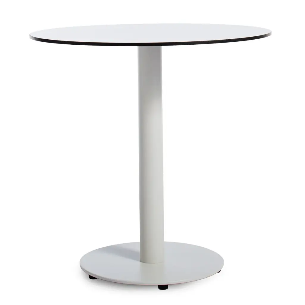 Crisp minimal white powder-coated aluminum and solid laminate top. Clean lines designed to weather the elements.