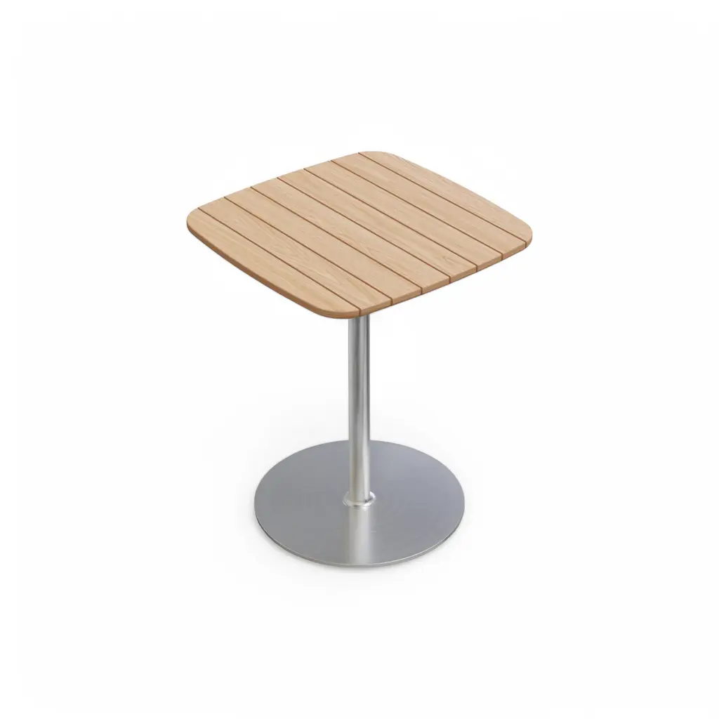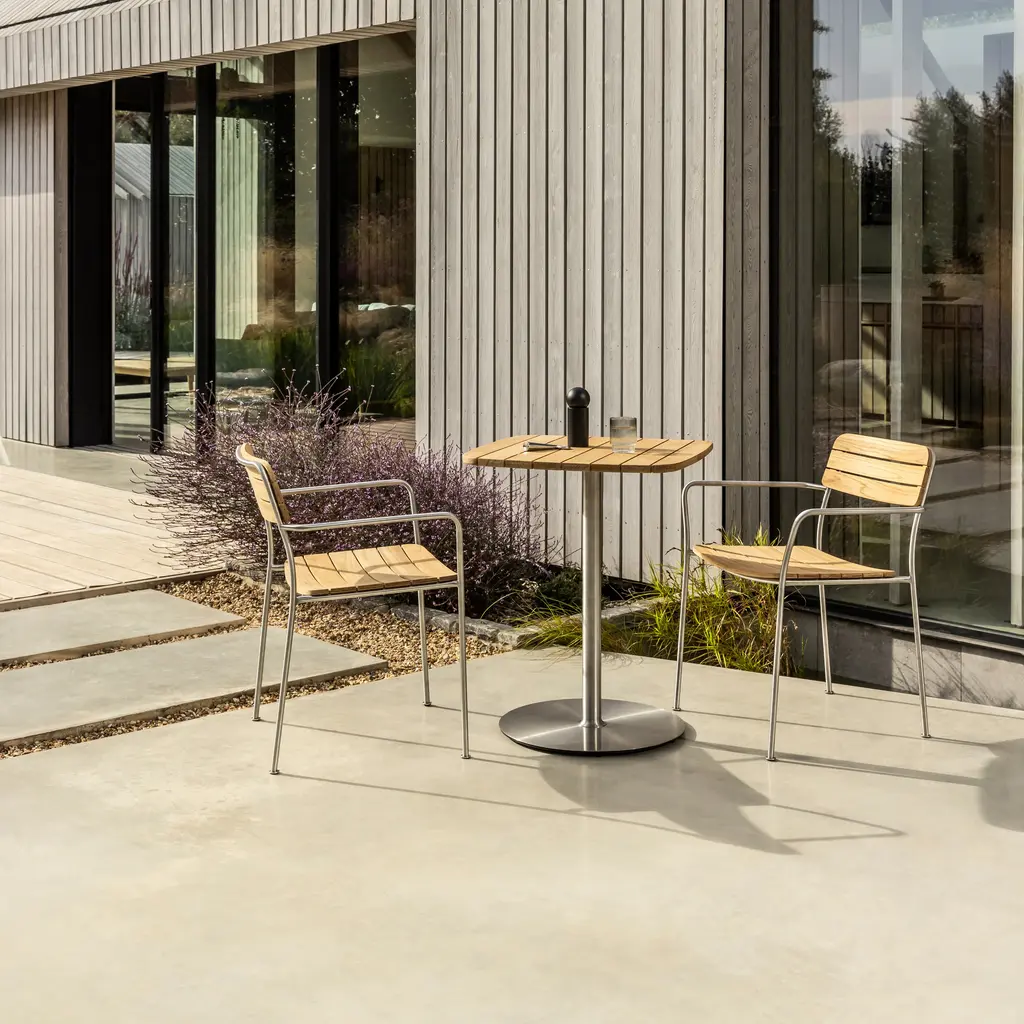 Compact, balanced, and quietly refined—the Solas Outdoor Café Table brings the same clarity of purpose found across Matthew Hilton’s Solas series, but in a smaller footprint made for balconies, patios, or terrace corners. The round-edged teak top, set on a minimalist stainless steel pedestal base, offers just enough space for two people to share a coffee, a meal, or a late afternoon drink. As with the rest of the Solas line, the materials were chosen with care: responsibly sourced teak that will weather naturally over time, and cold-formed stainless steel that’s resistant to rust and made to last. The table’s compact scale doesn’t compromise its presence—it feels solid, intentional, and built to withstand both time and the elements. Whether you’re outfitting a contract space or finishing a home patio, this is outdoor furniture that works quietly and gracefully.