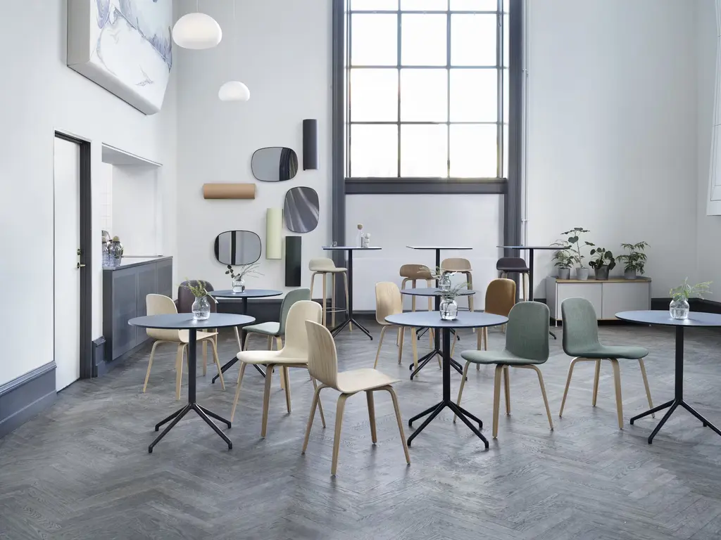 The Still Cafe Table (2019) is designed for clean expression and functionality. It features a four-legged base complemented by the angled edges of its tabletop. It makes an elegant match for any kitchen area, cafe, restaurant, bar, or office setting. Made in Denmark.