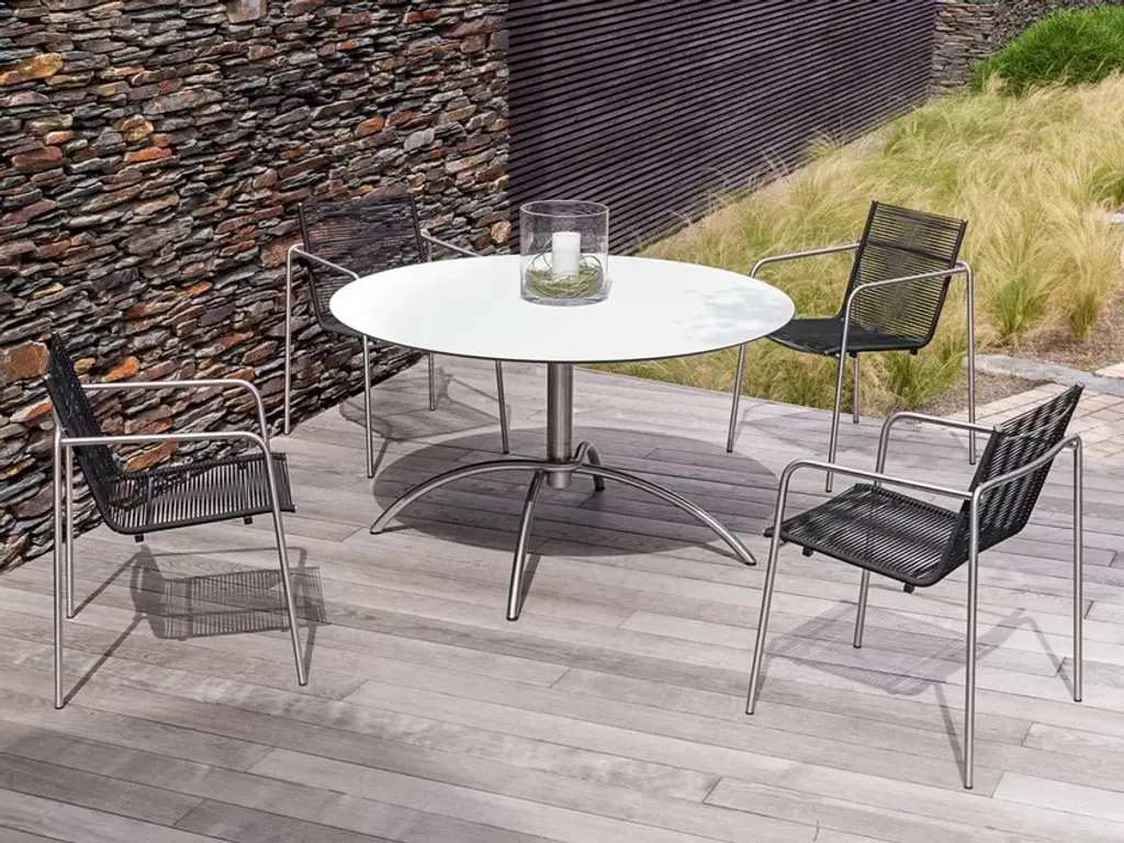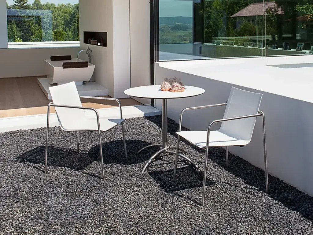 Universally applicable is the round stainless steel and fm-ceramtop Taku table. The polished or powder-coated stainless steel frame accommodates a variety of tabletops, and provides plenty of legroom. Different weather resistant table tops are available. Taku is the classic and often rewarded concept for In- and Outdoor use, that was developed by the danish designer Mads Odgard for the german outdoors specialist Fischer Möbel. The stacking chair is lightweight and shows a clear design. It is available in various colours of the proofed outdoor sling or with fm-rope, which give the chair an exclusive look and best comfort. The bistro tables with the elegant frame made out of stainless steel - natural, white or anthracite - holds the fm-laminate or fm-ceramtop table tops. The tables are offered in various sizes and colours.
