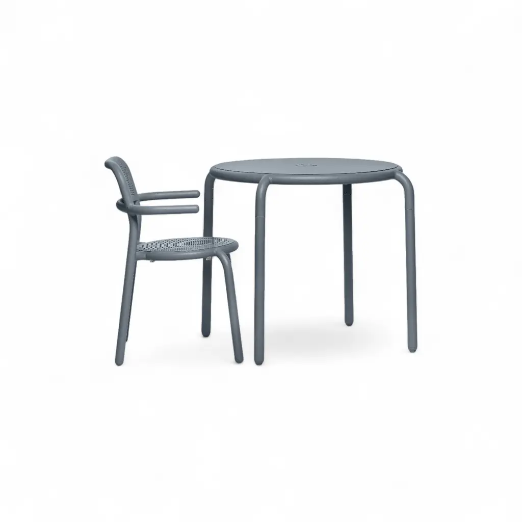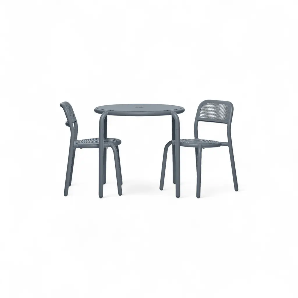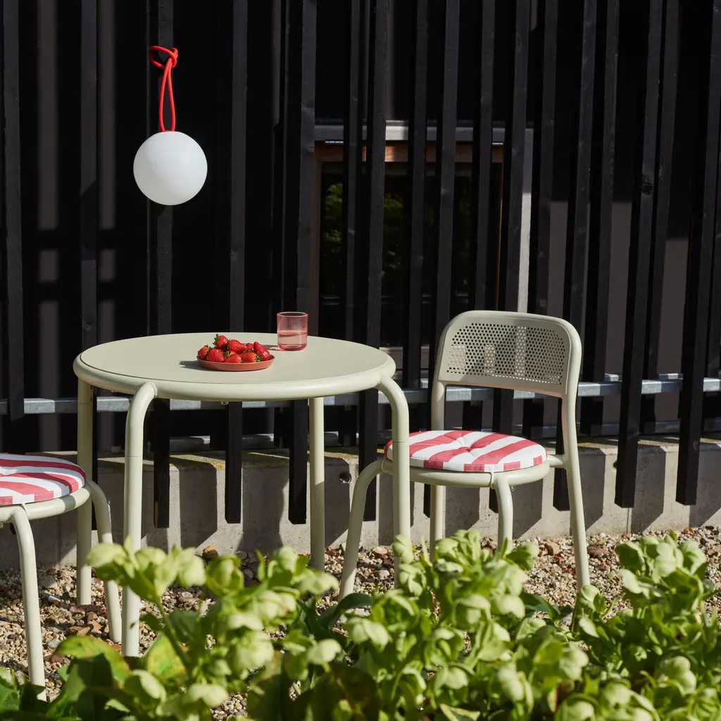 Toní Bistreau is the café table that moves wherever the shade is best. Powder-coated aluminum keeps it light in the hand but steady on the deck, and the perforated top lets rain drain straight through. Pull up two Toní Chairs for coffee, squeeze in four for tapas; when the patio clears, the tables nest in a tidy stack so you get your floor back. The center opening isn’t just a design quirk—it holds Fatboy’s Toní candle holder (sold separately) or an umbrella stem if the sun is fierce. UV-stable color stays true after long summers outside, and rubber tips under each leg keep the scrape to a whisper. Wipe it down with a damp cloth, call it a day. No rust worries, no heavy lifting—just an easy place to gather.