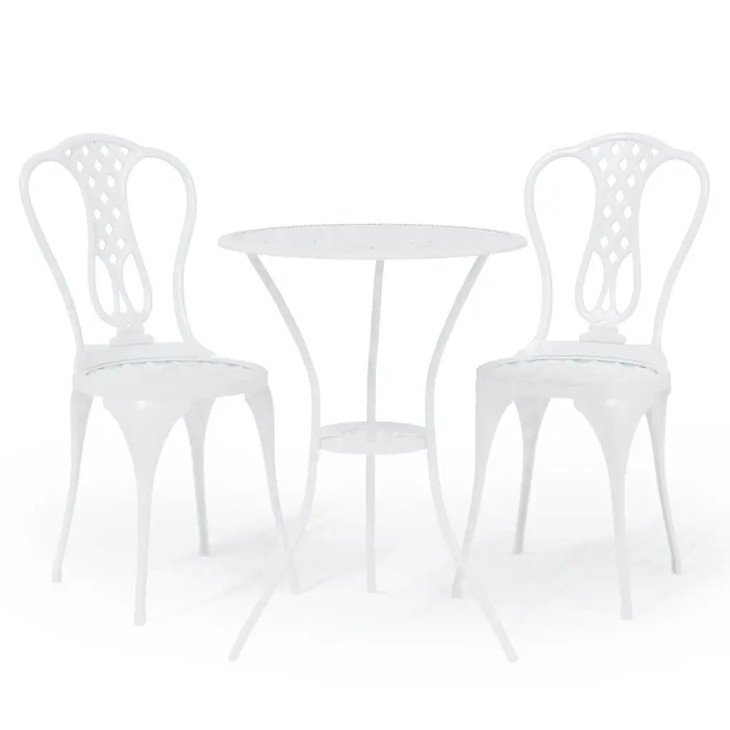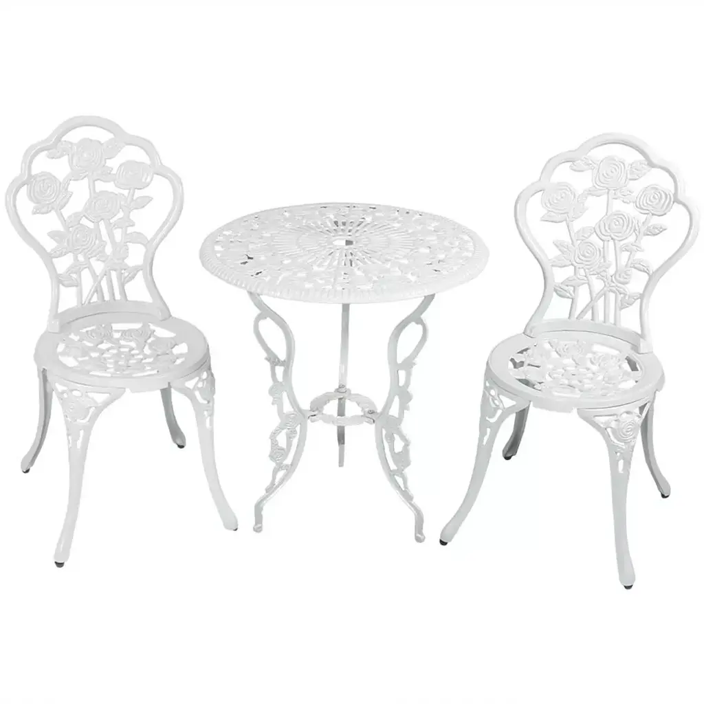 This chic 3-piece Bistro Set is just what dining fans need. It has a round table and two chairs, perfect for sprucing up both indoor and outdoor meals. The sleek white cast aluminum build works perfectly with any garden, patio, or balcony, creating a nice spot for family and friends to hang out. With its stylish floral pattern and smooth finish, this set is not just functional; it adds a touch of flair, letting everyone enjoy alfresco dining among nature's beauty. The Smart Design with a lovely floral motif makes this set a standout piece, enhancing your outdoor vibe.Built with a Strong Frame from cast iron, it guarantees stability and lasting use even outdoors.Perfect for Multi-Use, this bistro set suits casual lunches or fancy dinners, whether on your balcony, patio, or in the garden.Made for Easy Clean, the smooth metal surface is a breeze to maintain, great for busy lives.Seats 3 People, offering a nice dining experience without skimping on style.