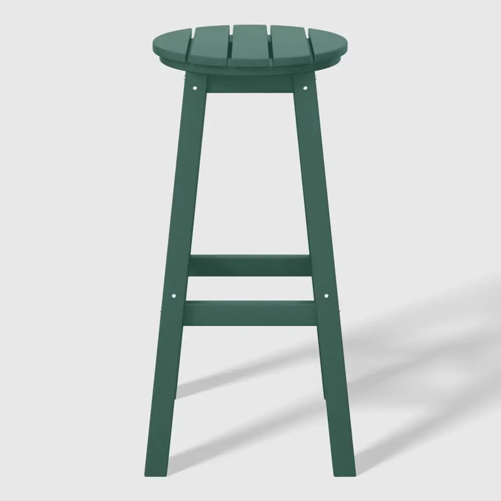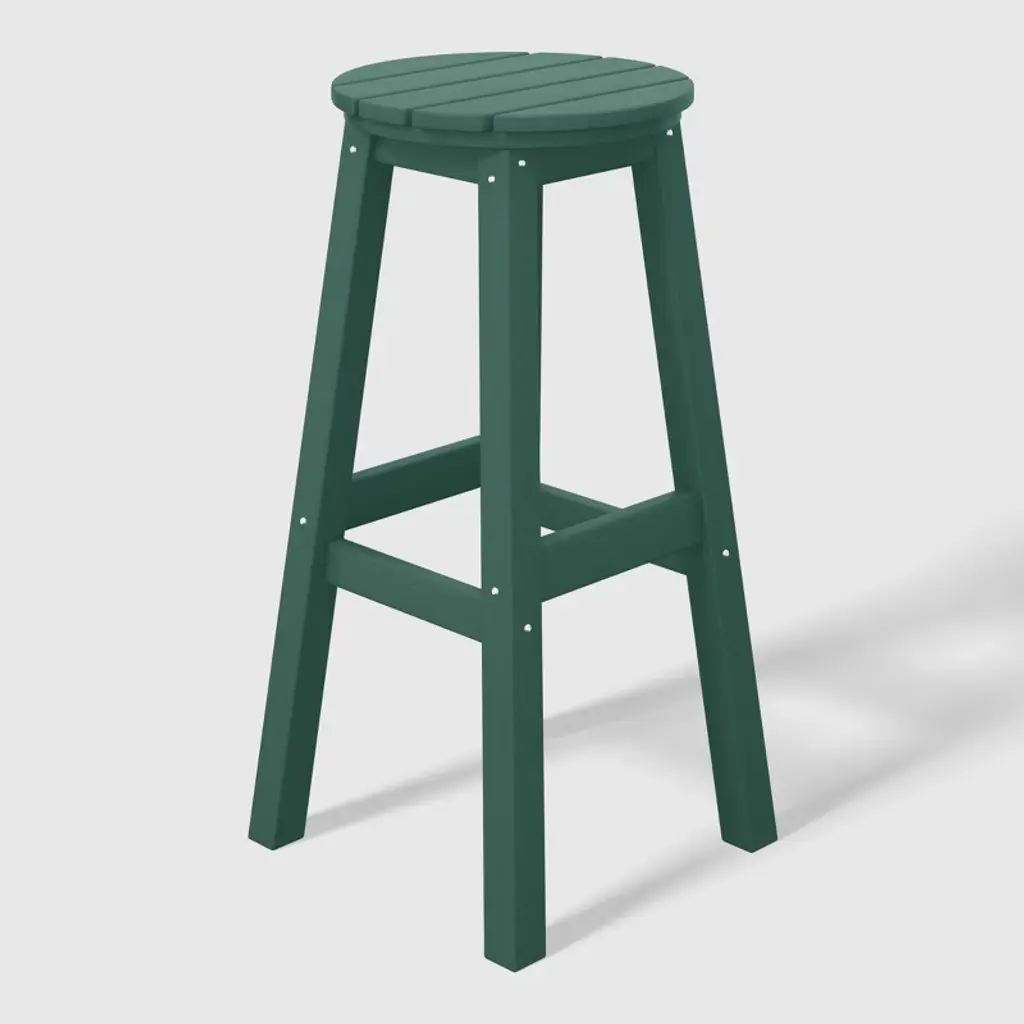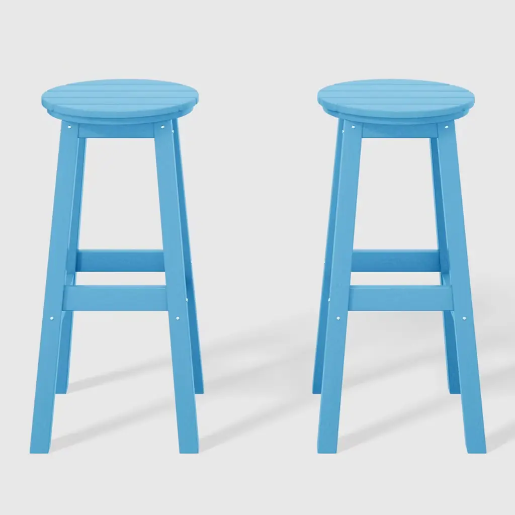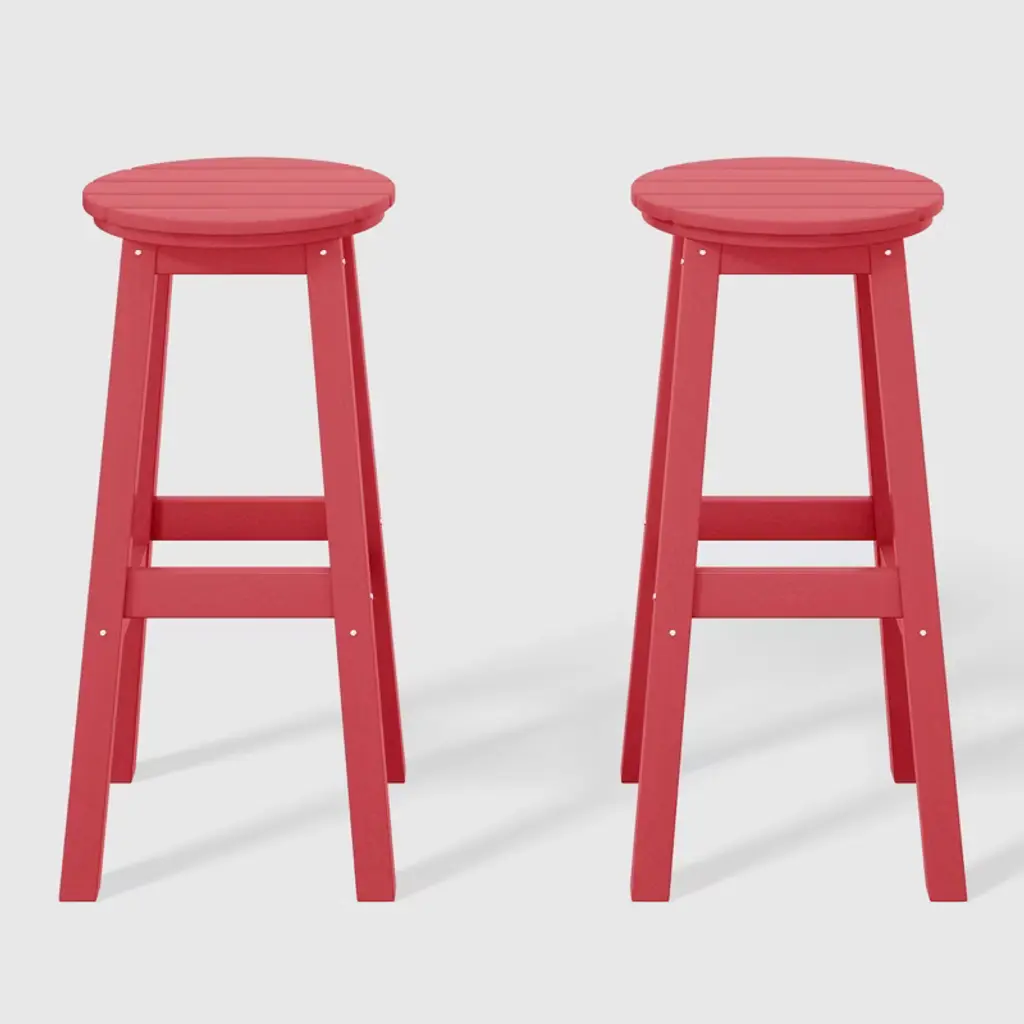 This set of two 29" backless bar stools presents a sophisticated addition to your outdoor patio, ideally suited for placement around your outdoor patio bar or bistro table. Crafted from durable and recycled HDPE material, its design is tailored for outdoor use, boasting UV and weather-resistant properties that safeguard the stool. Available in a palette of fade-resistant solid colors, it ensures the enduring vibrancy of its charming hue each season. The backless design makes for seamless storage underneath the table, offering both versatility and elegance. The classic yet modern aesthetic effortlessly harmonizes with your existing decor, while the A-frame design, supported by four sturdy square legs and foot bars, provides a well-balanced and comfortable seating experience.While we strive to accurately represent product colors, please be aware that actual colors may vary slightly due to individual screen settings and lighting conditions. FeaturesSet of two (2) 29" round bar stoolsConstructed from robust and environmentally friendly HDPE materialWeather resistant to protect against the harsh outdoor elementsFade and UV resistant to protect against the sunStackable for simple storageStainless steel hardware prevents rustLightweight constructionDetails:Product Type: Patio Bar & Counter StoolsWhat's Included: (2) Bar StoolBar StoolDimensions: 13.75" W x 13.75" D x 29.75" HWeight: 14.5 lbs.Seat Width: 13.75"Seat Depth: 13.75"Seat Height: 29.5"Weight Capacity: 330 lbs.