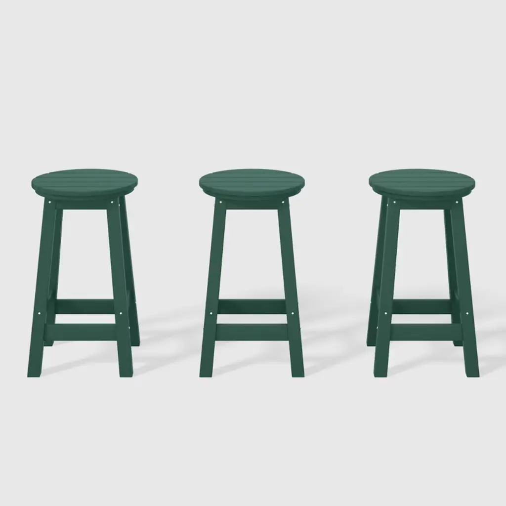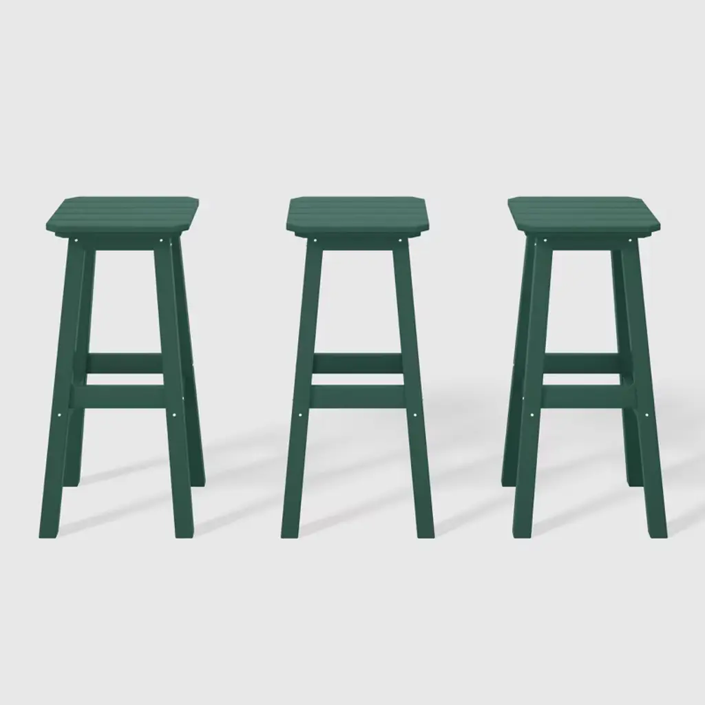 These 29" square-seat bar stools presents a sophisticated addition to your outdoor patio, ideally suited for placement around your outdoor patio bar or bistro table. Crafted from durable and recycled HDPE material, its design is tailored for outdoor use, boasting UV and weather-resistant properties that safeguard the stool. Available in a palette of fade-resistant solid colors, it ensures the enduring vibrancy of its charming hue each season. The backless design makes for seamless storage underneath the table, offering both versatility and elegance. The classic yet modern aesthetic effortlessly harmonizes with your existing decor, while the A-frame design, supported by four sturdy square legs and foot bars, provides a well-balanced and comfortable seating experience.While we strive to accurately represent product colors, please be aware that actual colors may vary slightly due to individual screen settings and lighting conditions. FeaturesSet of three (3) patio backless bar stoolsConstructed from robust and environmentally friendly HDPE materialWeather resistant to protect against the harsh outdoor elementsFade and UV resistant to protect against the sunA-frame construction adds stabilityStainless steel hardware prevents rustLightweight constructionDetails:Product Type: Patio Bar & Counter StoolsWhat's Included: (3) Bar StoolBar StoolDimensions: 13.5" W x 13.75" D x 29.5" HWeight: 14.5 lbs.Seat Width: 13.5"Seat Depth: 13.5"Seat Height: 29.5"Weight Capacity: 330 lbs.
