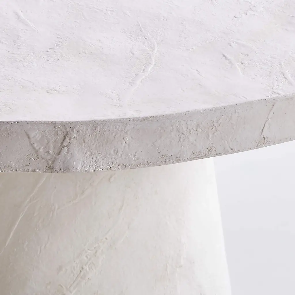Our Willy bistro table distills the classic pedestal table down to its striking essentials. The table's bold conical pedestal and simple round top are made from concrete material that creates a plaster-like appearance but is lighter in weight and more easily fabricated into these dramatically simple shapes. Bistro-scaled to seat two, the table is lightly textured to resemble the earthy feel and rustic look of actual plaster. The Willy White Plaster Pedestal Dining Table is a Crate & Barrel exclusive.