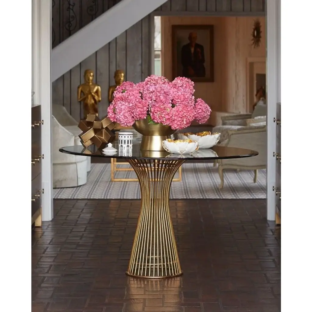 This round, cage style side table by Worlds Away exudes sophistication and feminine grace. Sweeping iron spindles are meticulously crafted from stainless steel for a jewelry quality aesthetic. The eye catching base sits beneath a round, beveled glass top, so you can appreciate this glamorous silhouette from all angles. Curvaceous, clean, and comely, Powell is truly sublime. Also available in gold leaf.