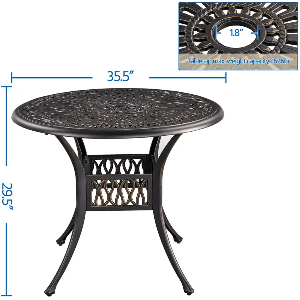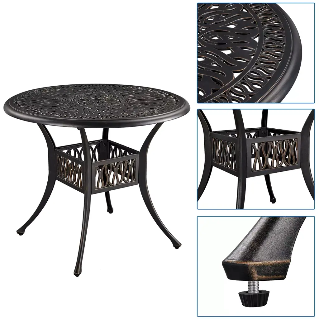 Our elegant patio bistro table is suitable for most outdoor setting or events. Classic & Vintage design with floral-petal-shaped back add more antique charm to your designated place; Sturdy aluminium ensures this patio bistro table is sturdy and durable; Rust-resistant and water-proof coating does not fade easily; Umbrella hole serve more versatility for any outdoor space; Adjustable foot pads help adjust and control the balance of the bistro table according to different patio situation; Our outdoor dining table can be placed in most outdoor events such as an outdoor wedding ceremony, patio setting for cafe and so on. Specifications: Materials: AluminiumColor: BronzeOverall Dimension: 35.5×29.5"(Dia.×H)Diameter of Umbrella Hole: 1.8" Note: 1. Please see the image for exact measurements.2. Please allow ±0.5inch errors due to manual measurements.3. Please do not stand on the table for your safety.