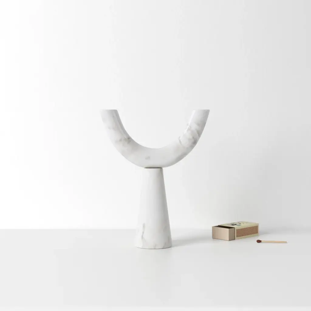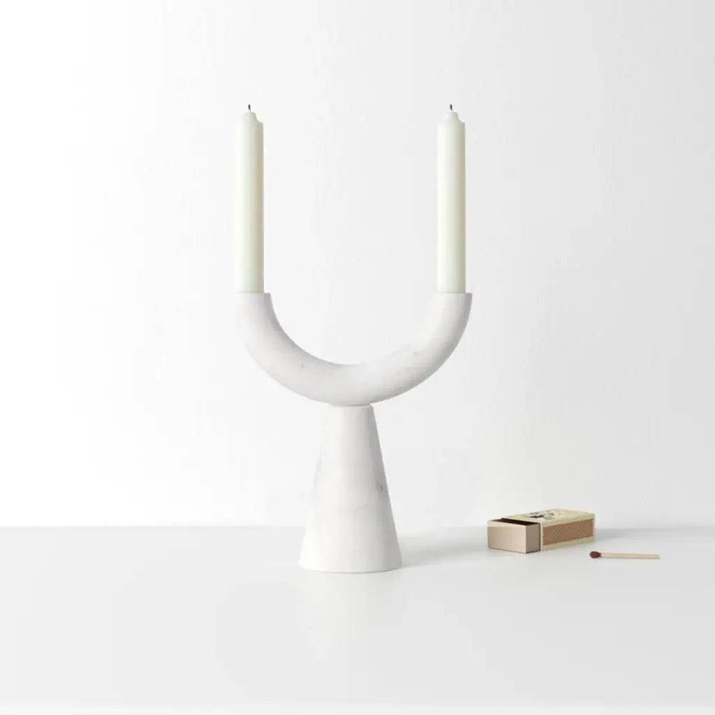 Monumental arch. Perched on a tapered base, this candle holder’s sweeping, U-shaped arm accommodates two standard tapers, offering a stylish modern take on the classic candelabra silhouette. It’s crafted from smooth white marble that showcases distinctive veining + variations, for a luxe organic look.