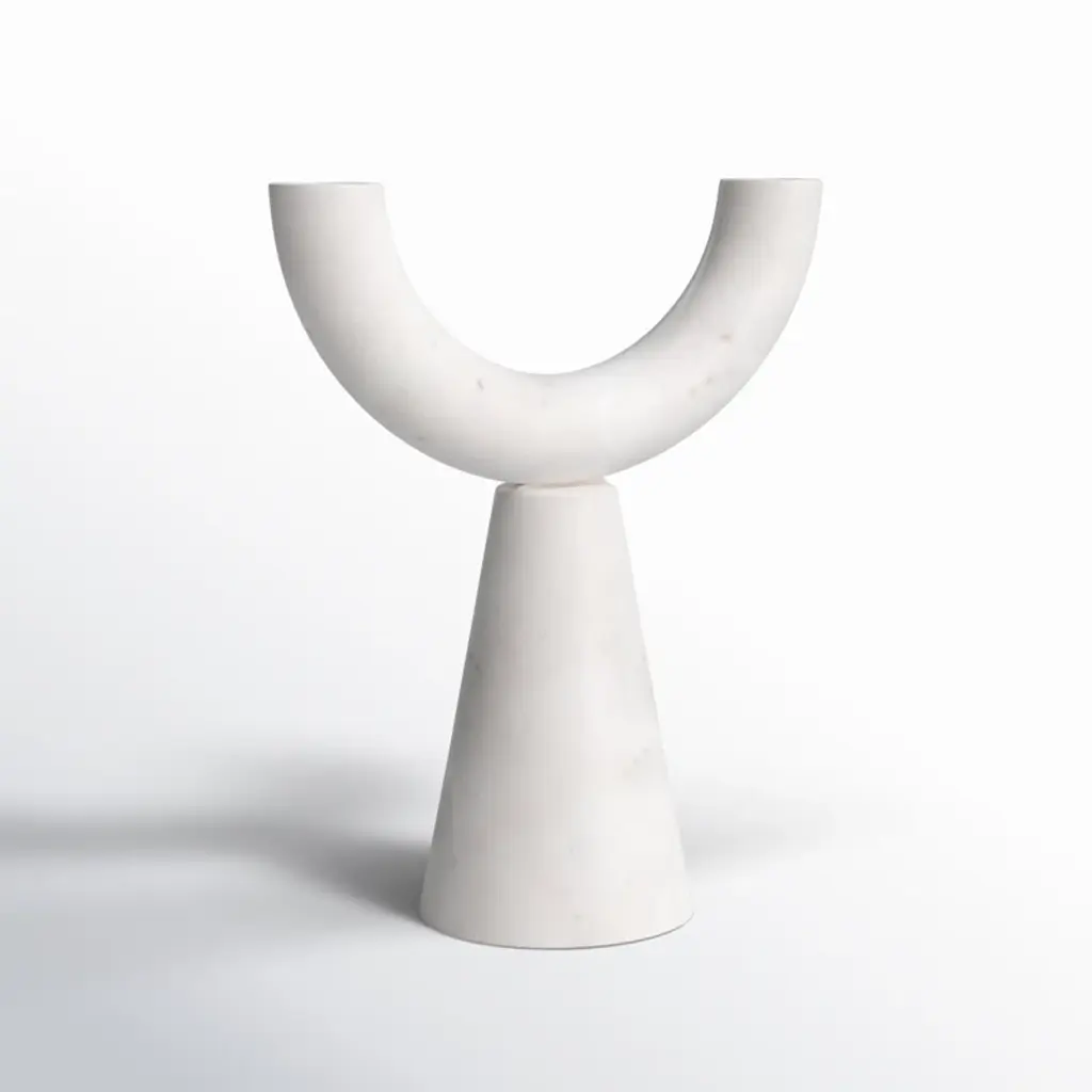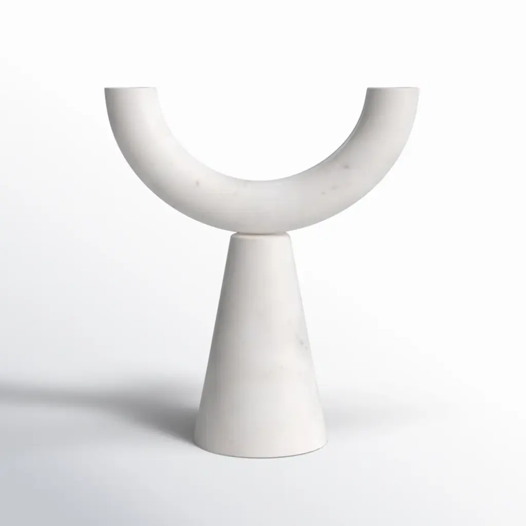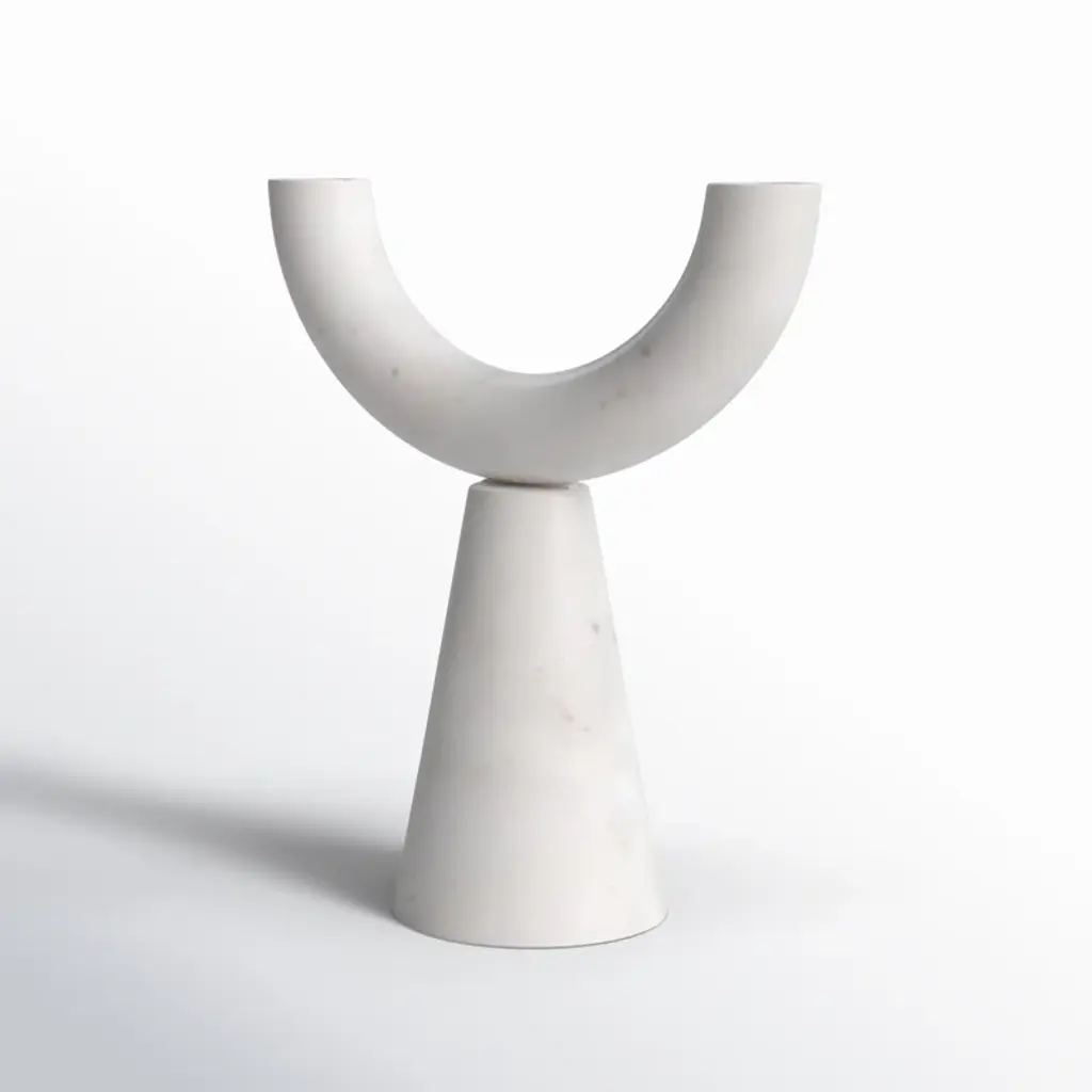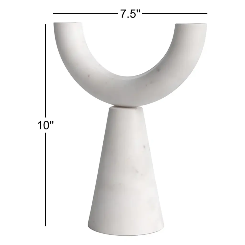 A modern arch perched on a tapered base, this candle holders sweeping U-shaped arm accommodates two standard tapers. Crafted from smooth white marble showcasing distinctive veining and variations for a luxe organic look, this piece offers a stylish take on the classic candelabra silhouette.