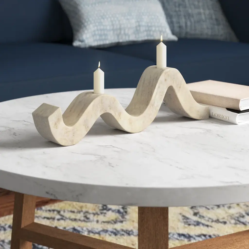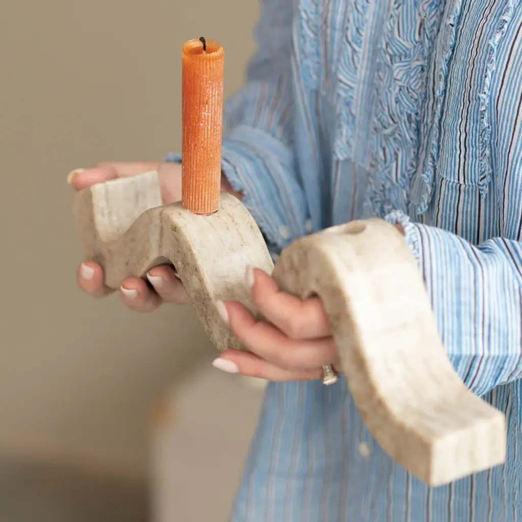 Elevate your tabletop decor with this hand-finished marble candle holder. Designed to hold a single taper candle, it brings a touch of sophistication to any dinner party or cozy evening at home. The natural marble material adds a sense of luxury and elegance to your space, while the hand-finishing ensures each piece is truly one-of-a-kind. Place it on your dining table or mantel for a warm, inviting ambiance. Just remember, this lovely piece is for indoor use only, so keep it away from non-residential settings.