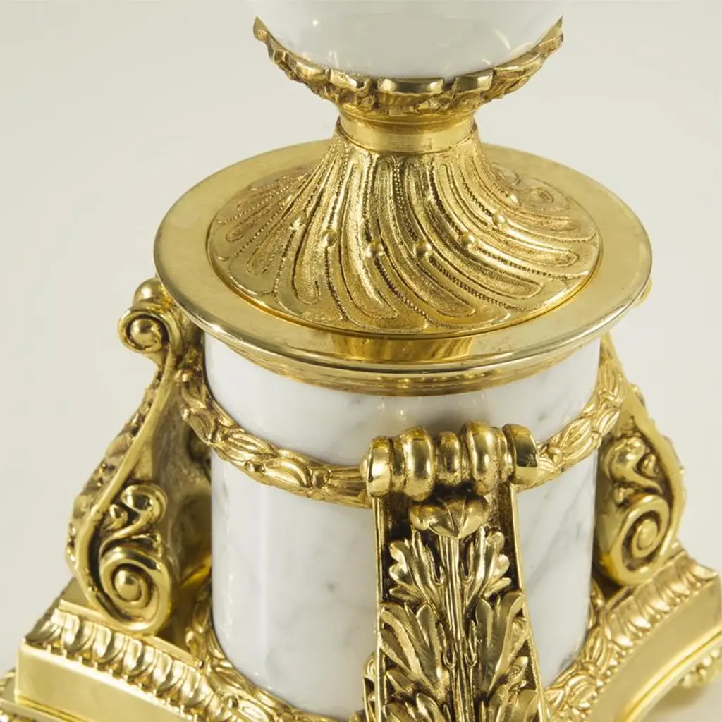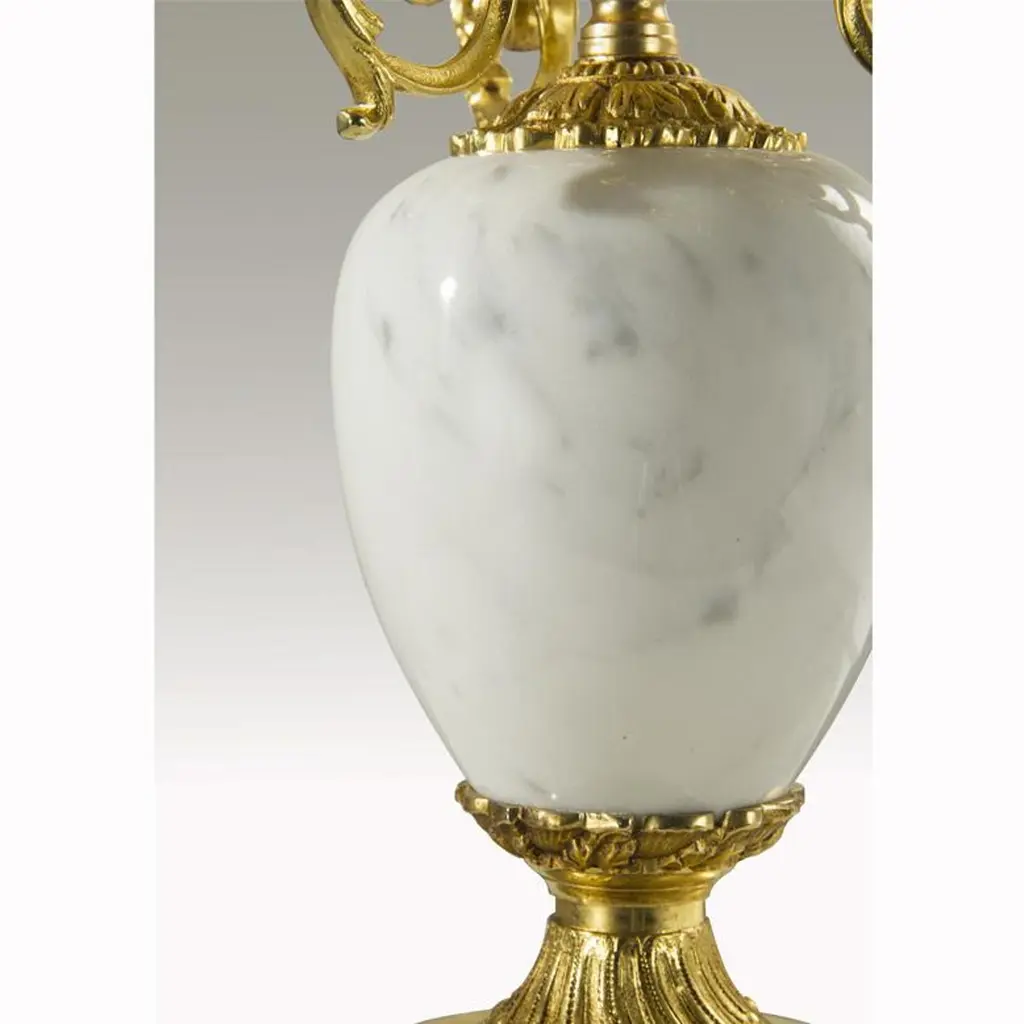 21st century 7- flame gold bronze and veined white Carrara marble candelabra. The bronze parts are made with the lost wax casting technique and then finely chiselled. This Candelabra has got 7-flames. On request to customer can modificate the metal finishing: french gold, burnished, dark burnished, antique silver and patinated silver so you can match it with any decor. The style of this candelabra is classic and can be inserted in the best possible way within every furniture.Each object is handcrafted and the care for every detail makes each item unique in its kind.Also Oggetti d'Arte will follow with the same passion the request of the most qualified studies of interior architecture from around the world, helping them in achievement of their most ambitious projects.