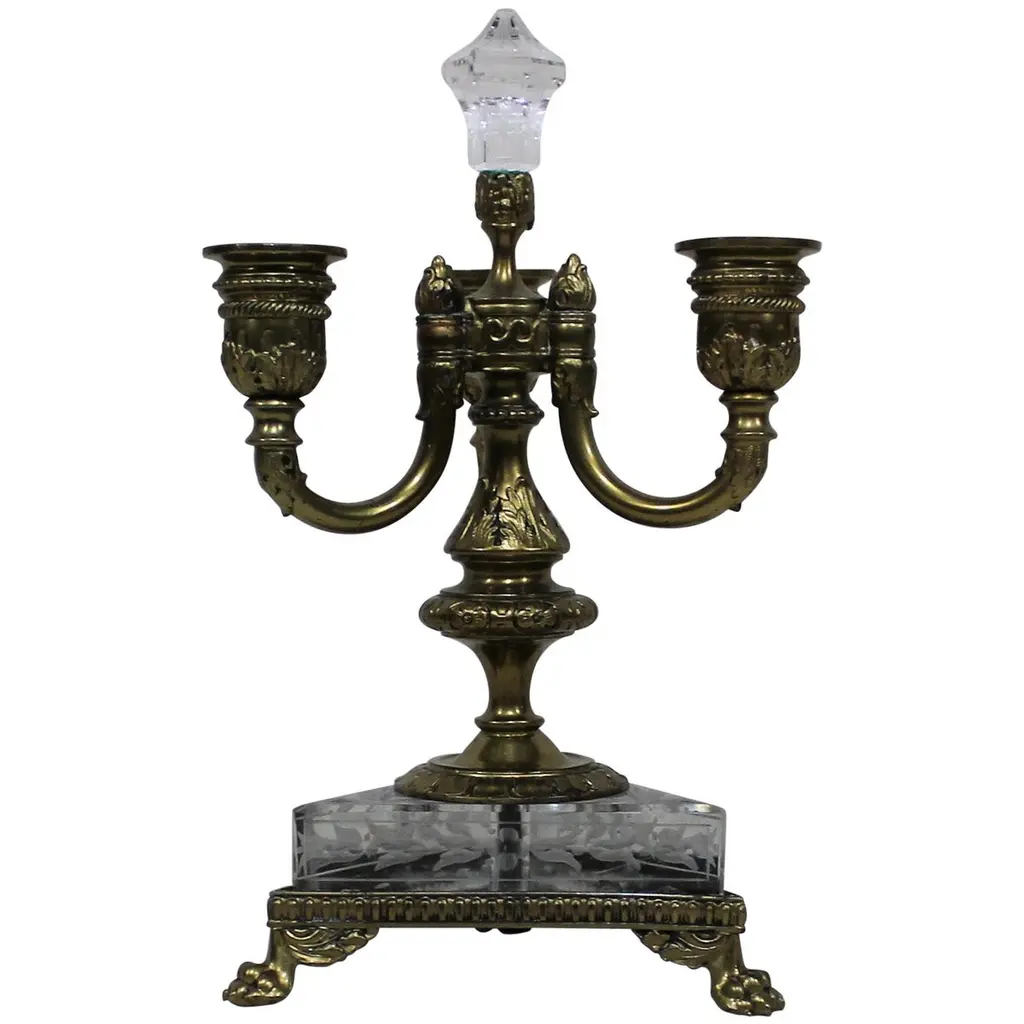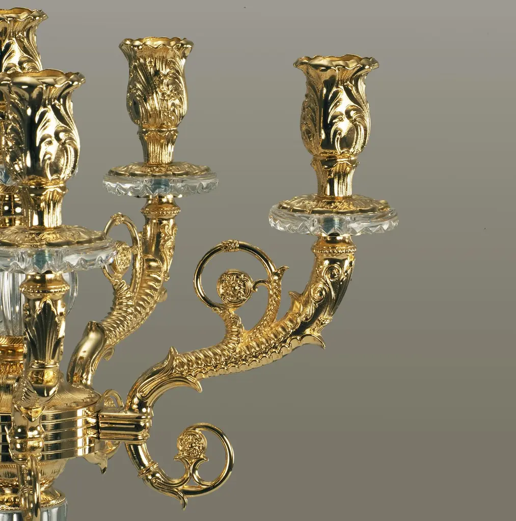 21st Century, Hand Carved Clear Crystal And Golden Bronze Candelabra