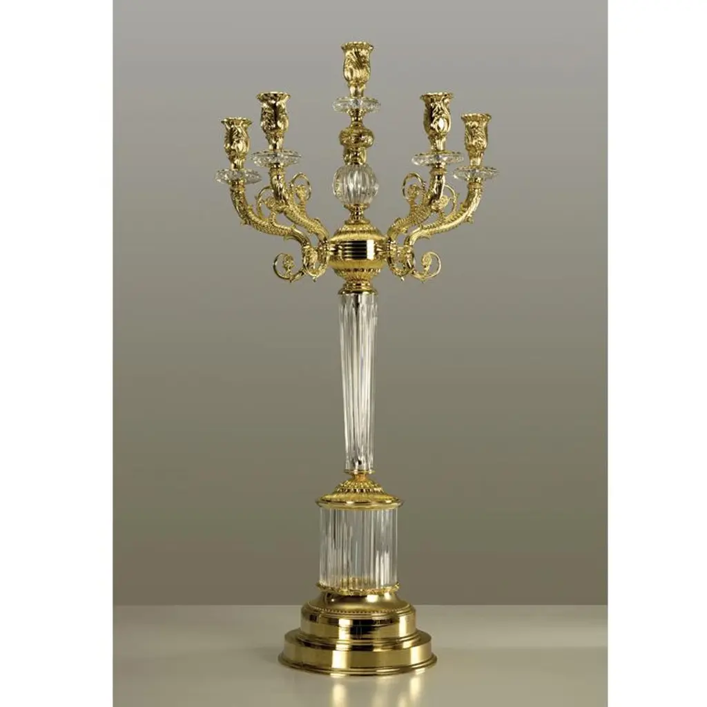 21st century hand carved clear crystal and golden bronze candelabra. This candelabra is finely chiseled lost wax castings and hand-grounded glass. This Candelabra has got 6-flames. On request to customer can modificate the color of crystal: pink, amber, amethist etc... and we can change also the metal finishing: french gold, burnished, dark burnished, antique silver and patinated gold so you can match it with any decor. The style of this candelabra is classic and can be inserted in the best possible way within every furniture.Each object is handcrafted and the care for every detail makes each item unique in its kind.Also Oggetti d'Arte will follow with the same passion the request of the most qualified studies of interior architecture from around the world, helping them in achievement of their most ambitious projects.