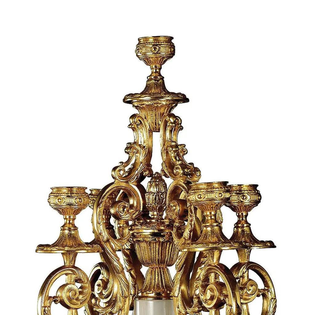 21st century white veined marble and golden bronze candelabra. This candelabra is finely chiseled lost wax castings. This Candelabra has got 5-flames. On request to customer can modificate the color of marble: pink, green and etc... and we can change also the metal finishing: french gold, burnished, dark burnished, antique silver and patinated gold so you can match it with any decor. The style of this candelabra is classic and can be inserted in the best possible way within every furniture.Each object is handcrafted and the care for every detail makes each item unique in its kind.Also Oggetti d'Arte will follow with the same passion the request of the most qualified studies of interior architecture from around the world, helping them in achievement of their most ambitious projects.