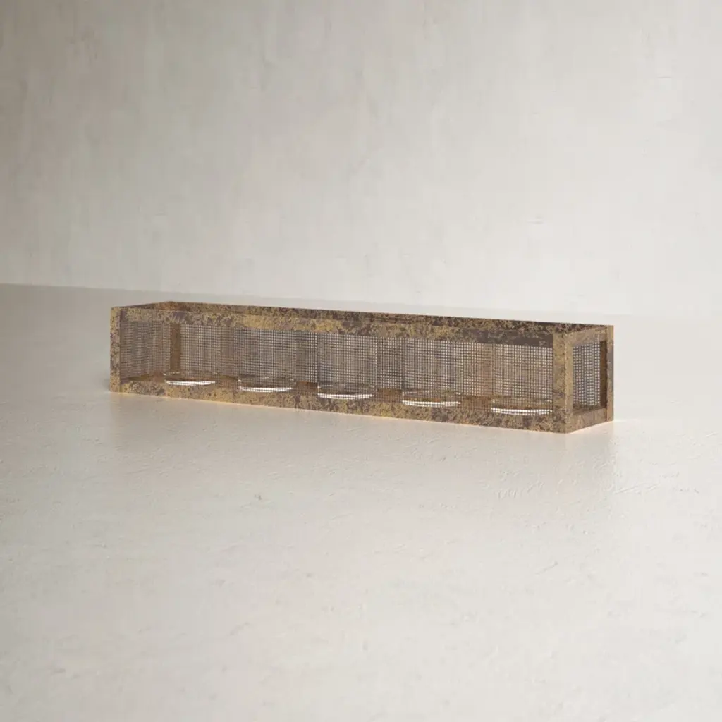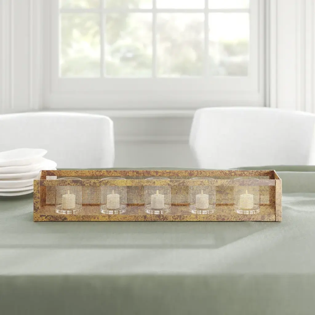 This farmhouse-style tabletop candelabra has a metal mesh surround that lets warm light cast over your dining room table. The five glass cylinders are supported by a metal base in a distressed finish for a well-loved look. Something to consider: The hurricane candle holders are compatible with either tealight or votive candles, but you'll need to buy those separately.