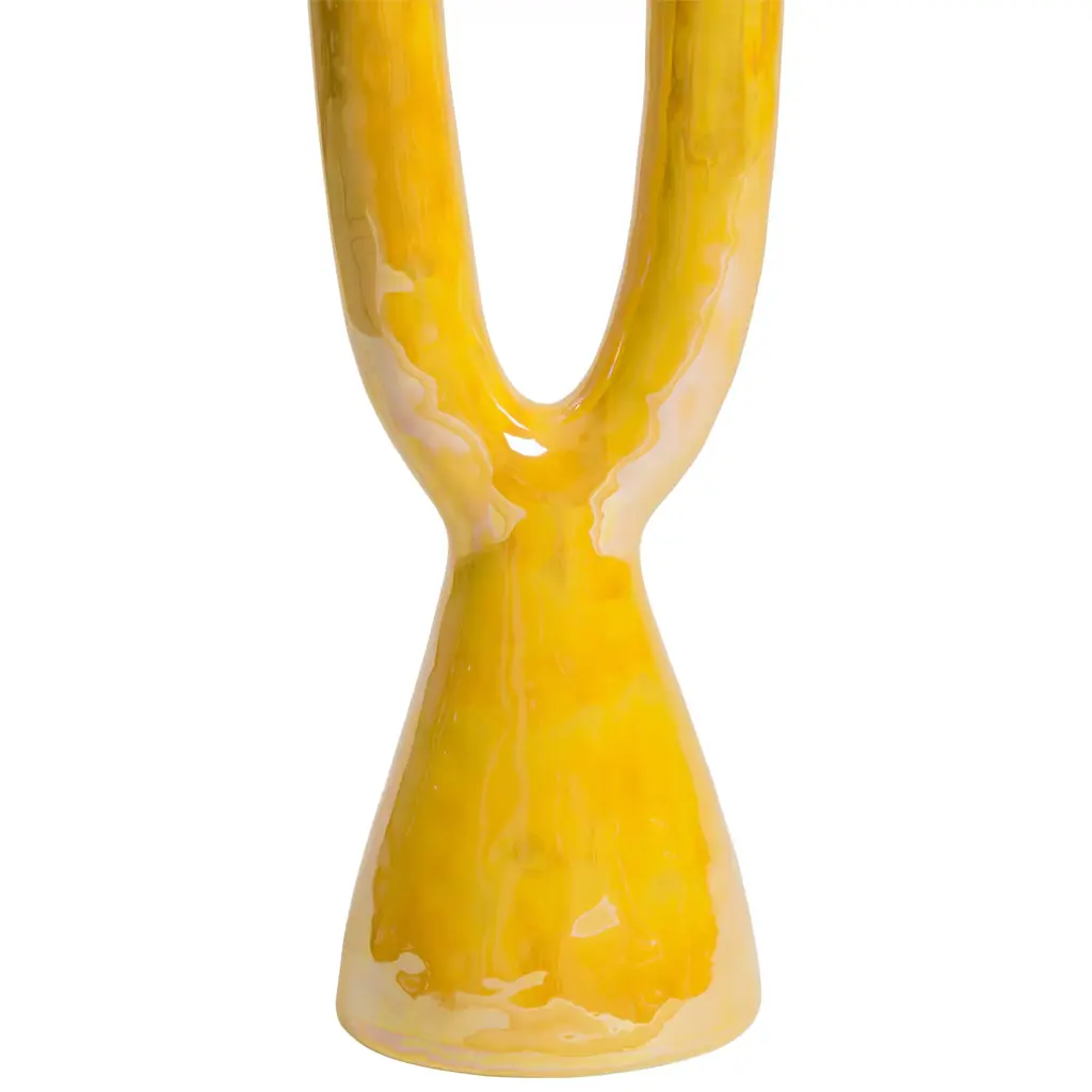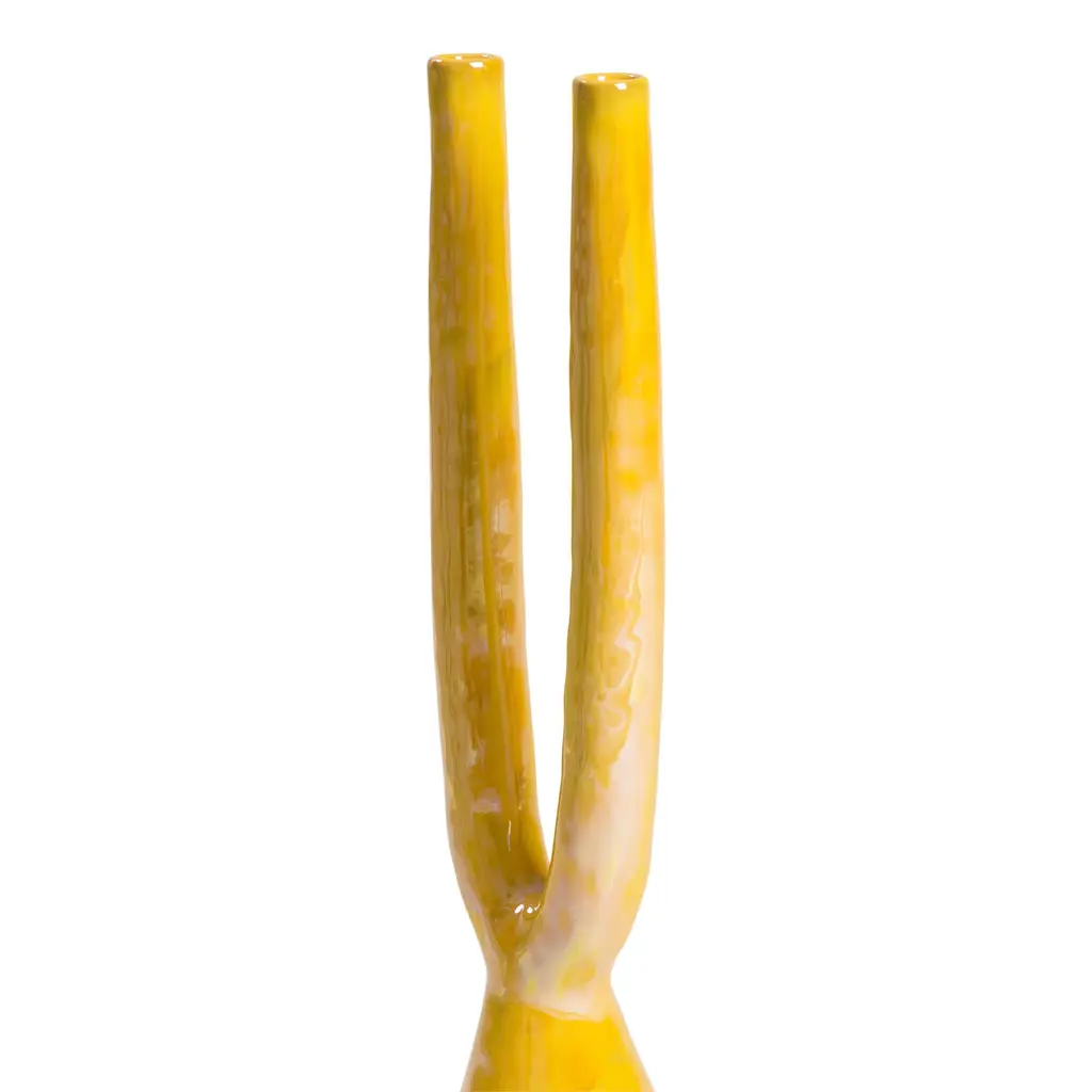 This double candle holder is a classy, modern décor piece by Gatti Ceramica. After the first firing, the maiolica original is hand-painted in a warm shade of yellow and then fired for the second time. The piece is finished with a mother of pearl luster and a third firing, in accordance with the time-honored techniques of Faenza, the ceramics capital in Northern-Italy.