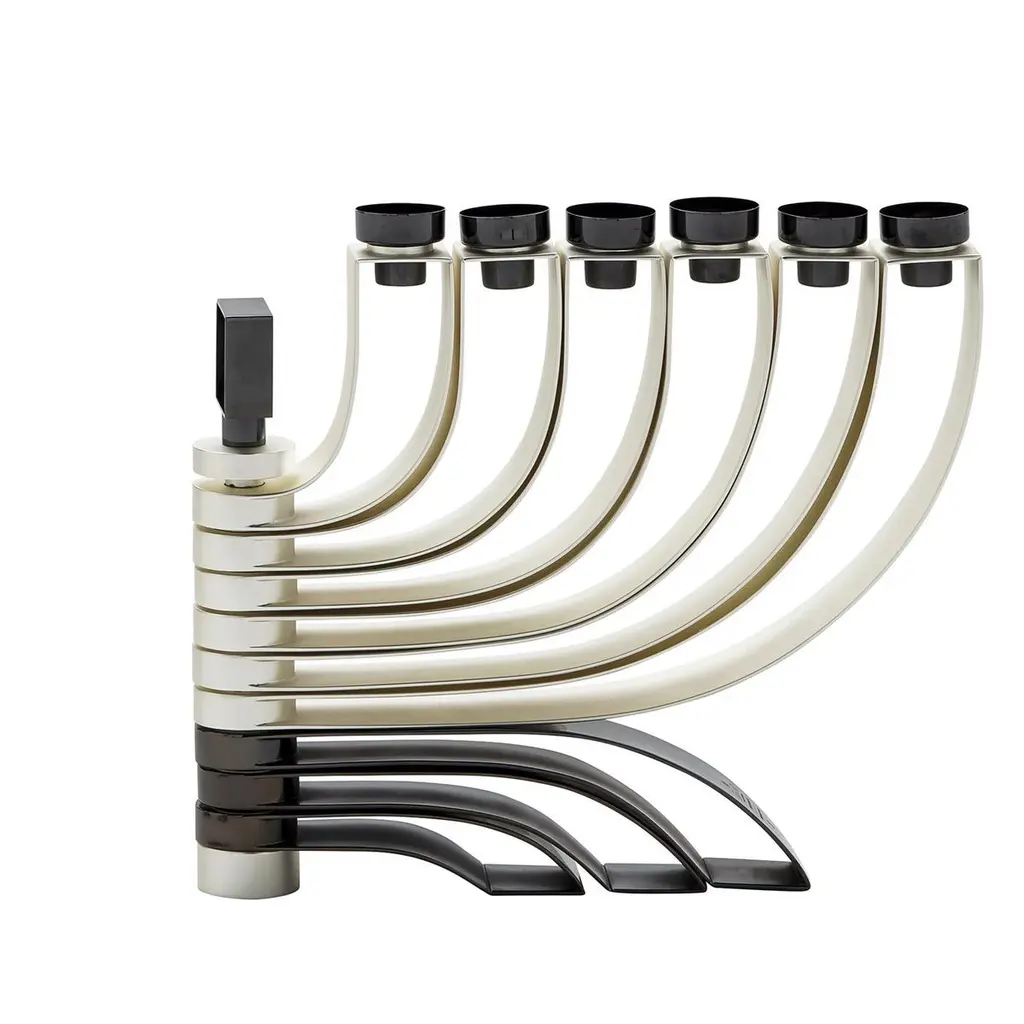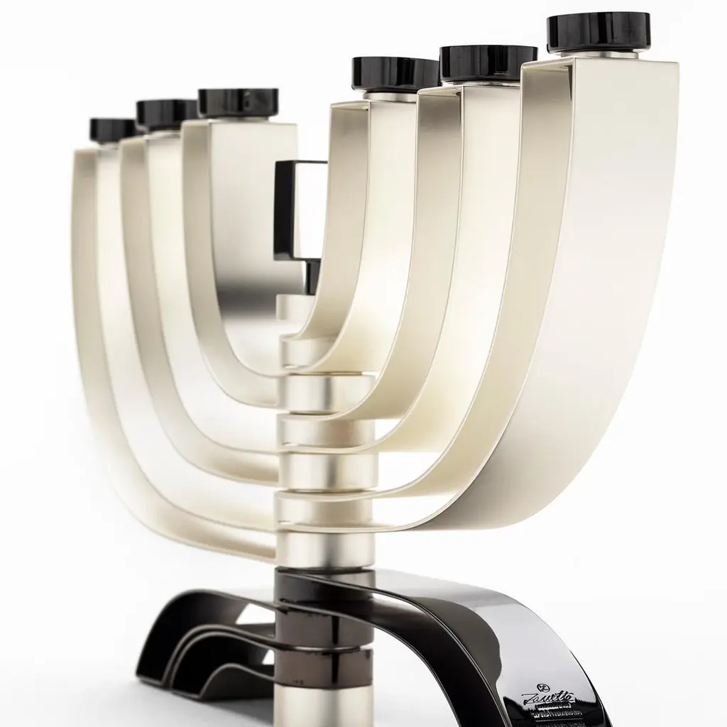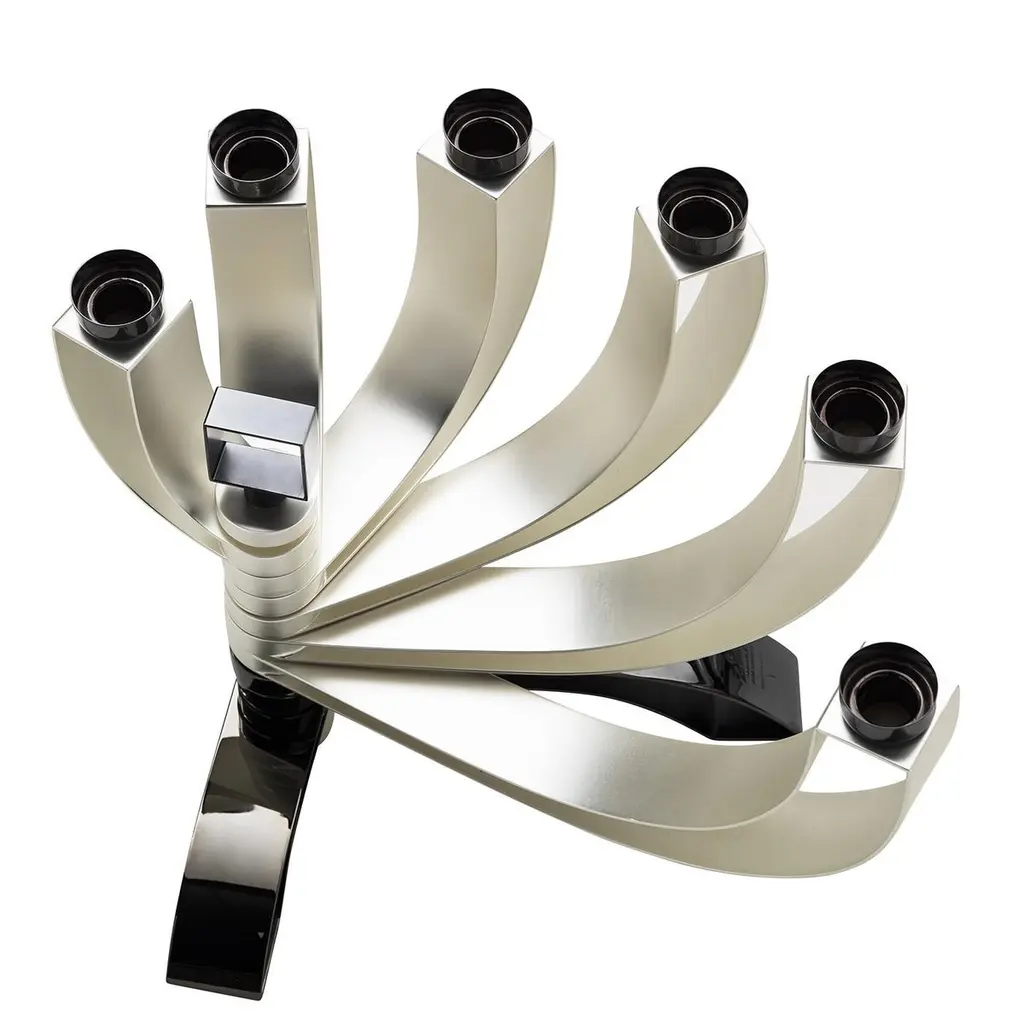 This superb table candelabra features a modern structure alternating titanium with satin silver. Boasting a sinuous and elaborate silhouette, the six shiny titanium candle holders are mounted on six pairs of silver arms, sustained on a titanium base that completes this impeccable design while securing balance.