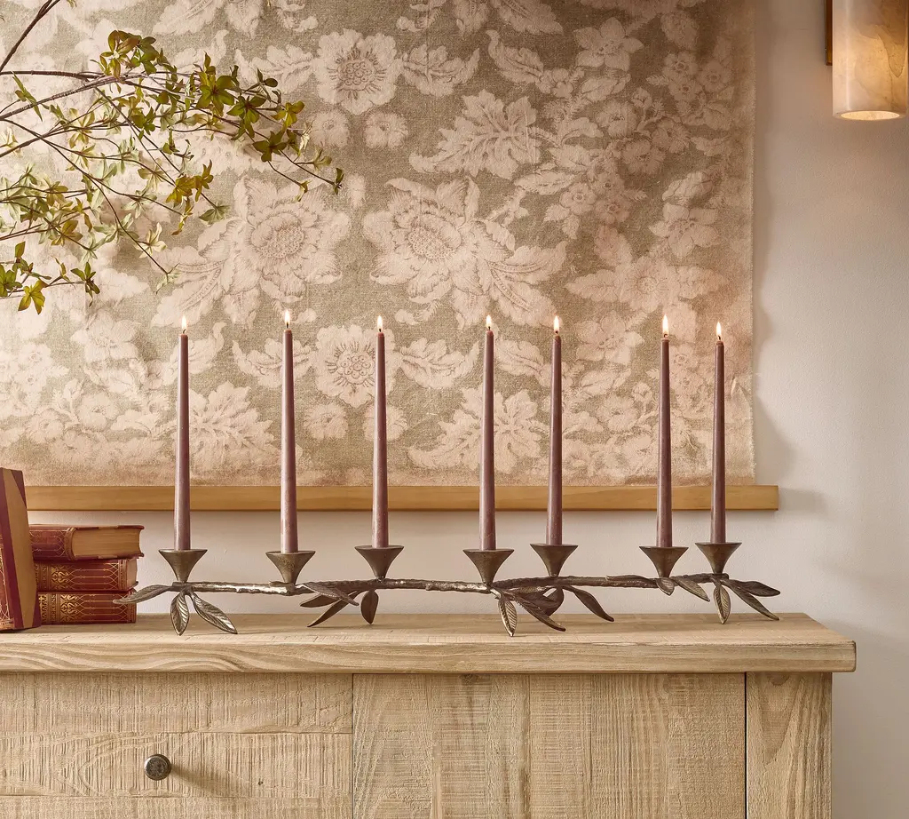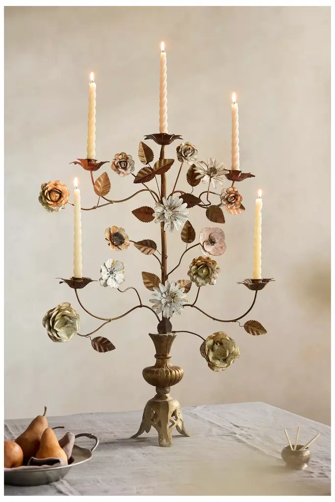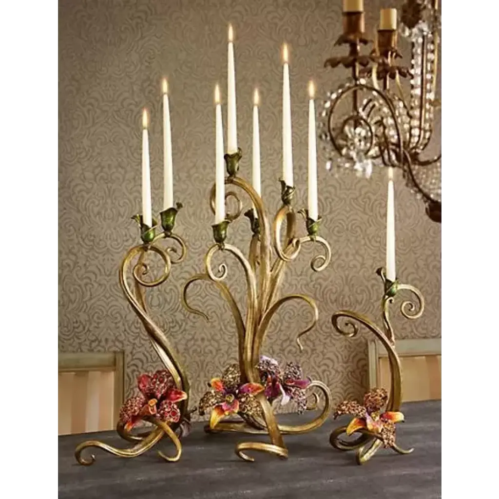Opulent scrolls, ascending from jeweled orchids, hold leaf-wrapped candles in our Aubree Orchid Candelabra. Striated hand-formed brass candlesticks and candelabra from India; fowers and leaf candle cups cast and hand-set with large faceted crystals in Rhode Island.