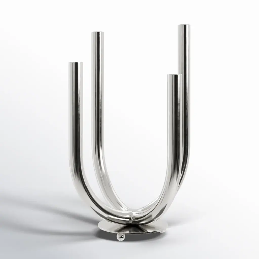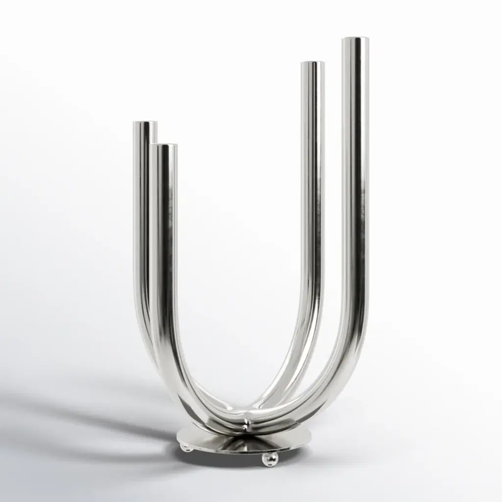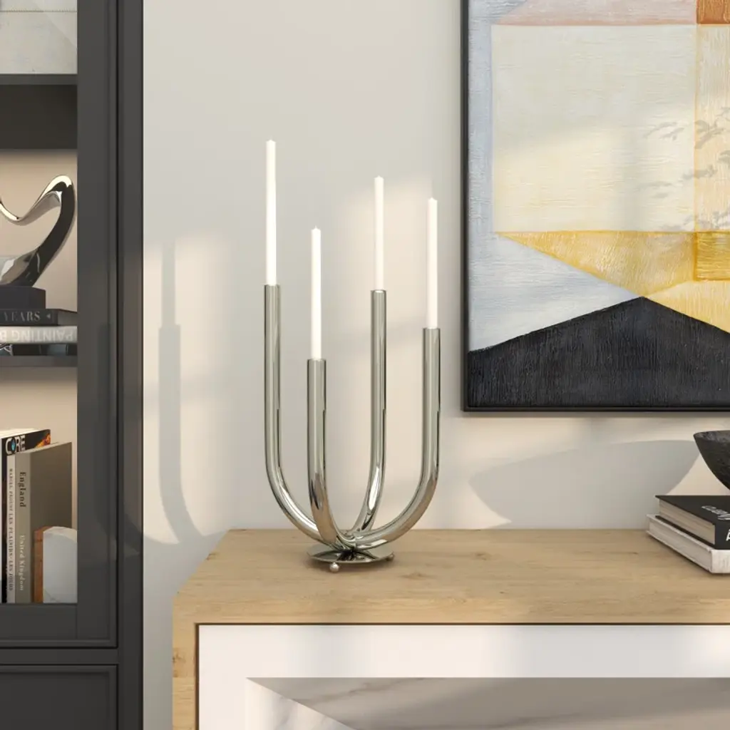 Appreciate the sculptural design as a stunning accent piece on a coffee table, mantle, or dining room table to create moody lighting and elegance in the home. Designed with felt or rubber stoppers at the base that prevent scratching furniture and table tops, as well as sliding around. Can hold 4 taper candles, not included. This item ships in 1 carton. Stainless steel candelabra makes a great gift for any occasion. Suitable for indoor use only. This item ships fully assembled in one piece. Made in India. This is a single silver colored candlestick holder. Contemporary style.