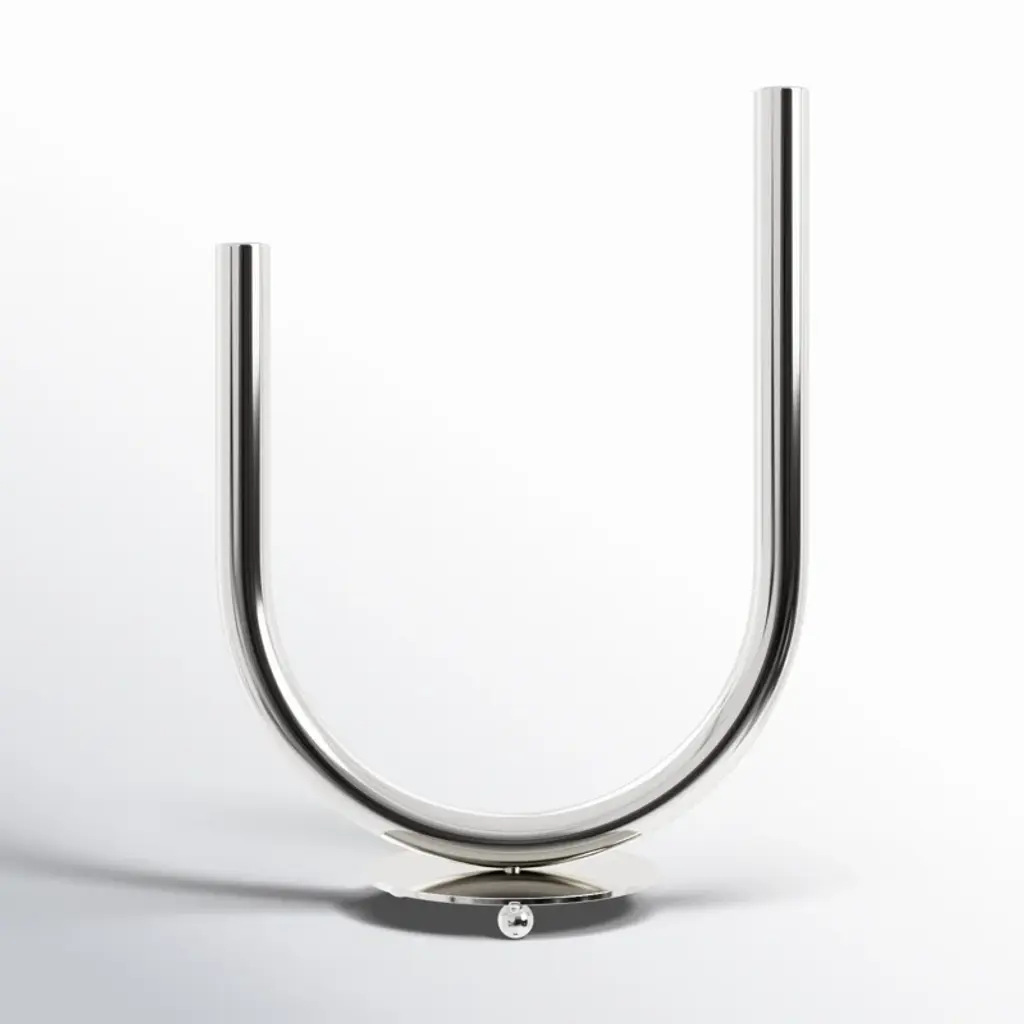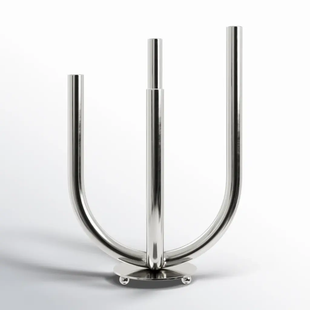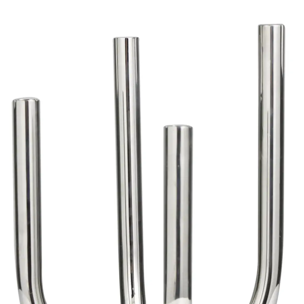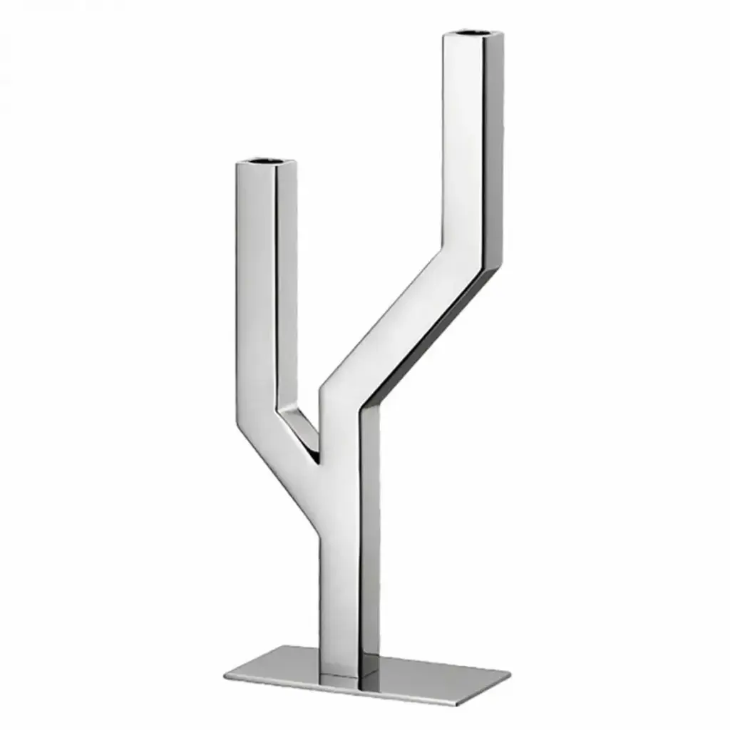 Appreciate the sculptural design as a stunning accent piece on a coffee table, mantle, or dining room table to create moody lighting and elegance in the home. Designed with felt or rubber stoppers at the base that prevent scratching furniture and table tops, as well as sliding around. Can hold 4 taper candles, not included. This item ships in 1 carton. Stainless steel candelabra makes a great gift for any occasion. Suitable for indoor use only. This item ships fully assembled in one piece. Made in India. This is a single silver colored candlestick holder. Contemporary style.
