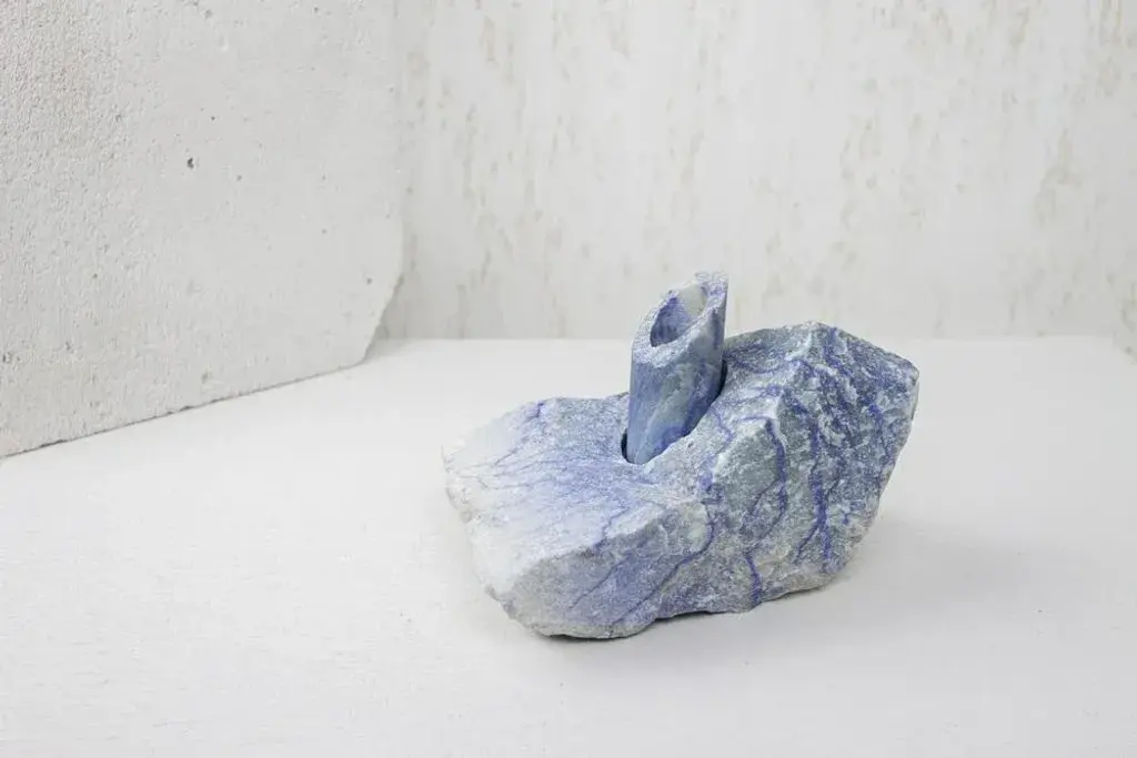 Blue quartz abra candelabra ii by studio do dimensions: d 19 x w 13 x h 13 cm materials: blue quartz, aluminum. 3.2 kg. Stone and fire are connected in an ageless bond. A sparkle created by clashing two stones with each other has been igniting fire over centuries. At the same time stones are used to safely border campfires. The warmth of the stone and intimate flame, reflect here on our interior environment. The classical shapes of candle holders are brought to light by extracting it from the core of a stone. Set in a 21st-century interpretation, it connects a timeless design type with a primitive appearing but contemporary driven technology.