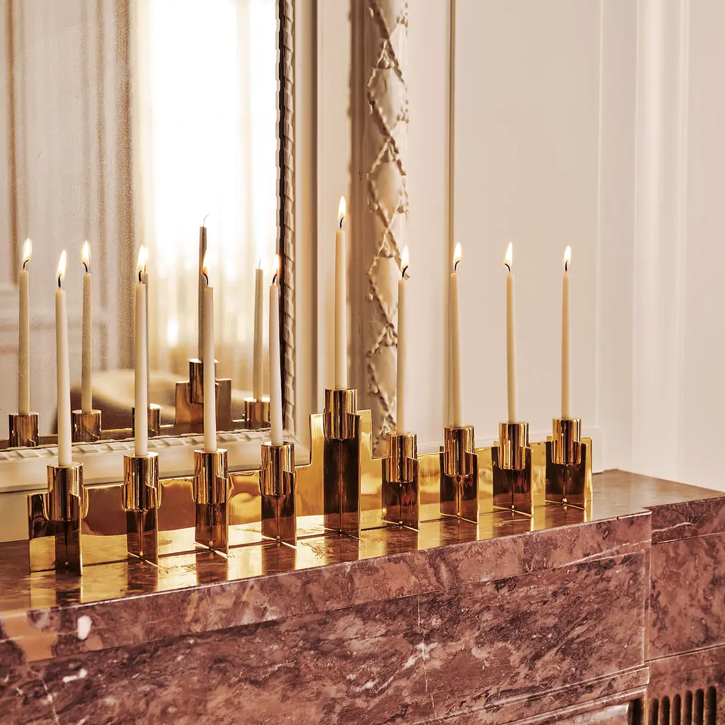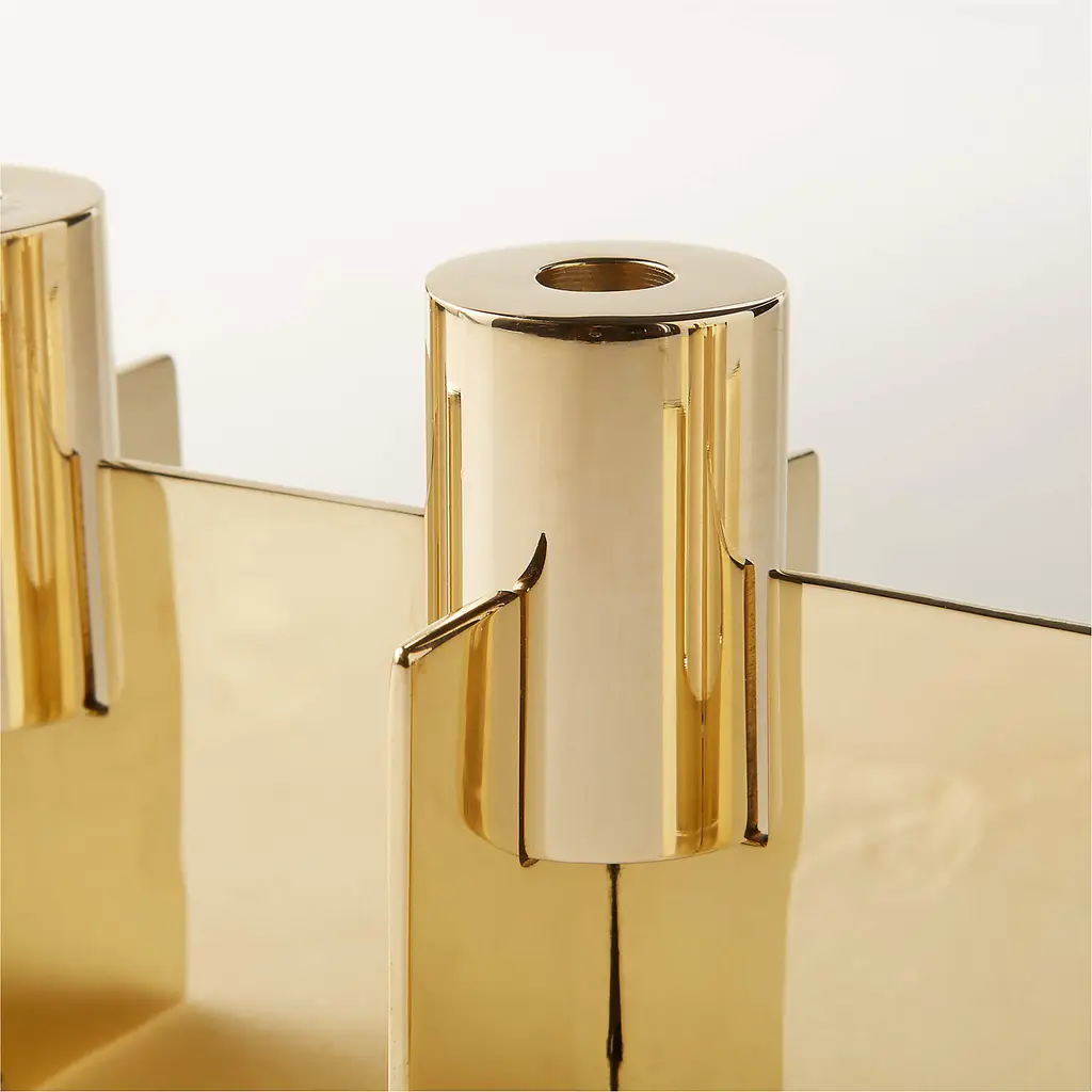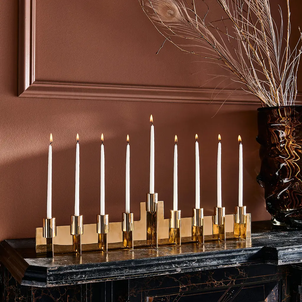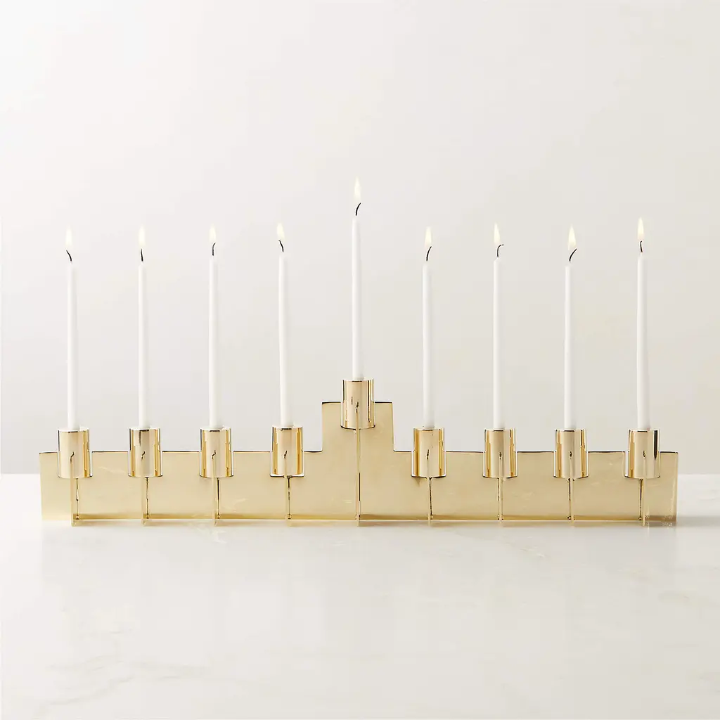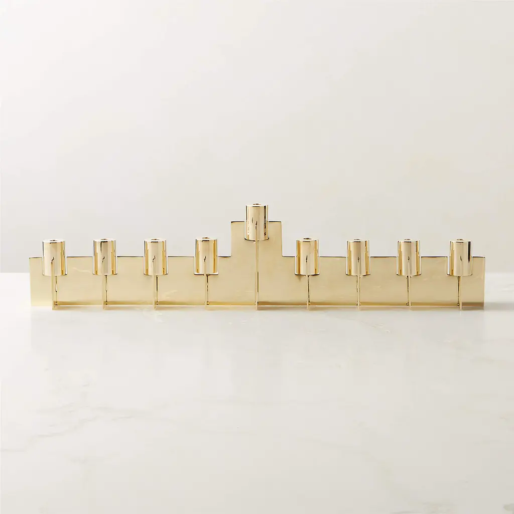 Angular modern menorah is striking in polished unlacquered brass. Each brass sheet is hand-cut using a dieline, then welded to form this custom design. Gleaming from the beginning, the brass will develop a natural patina over time and can be polished to restore the piece to its original state if desired. CB2 exclusive. Due to the nature of the material, brass patina will vary in color and darken over time.