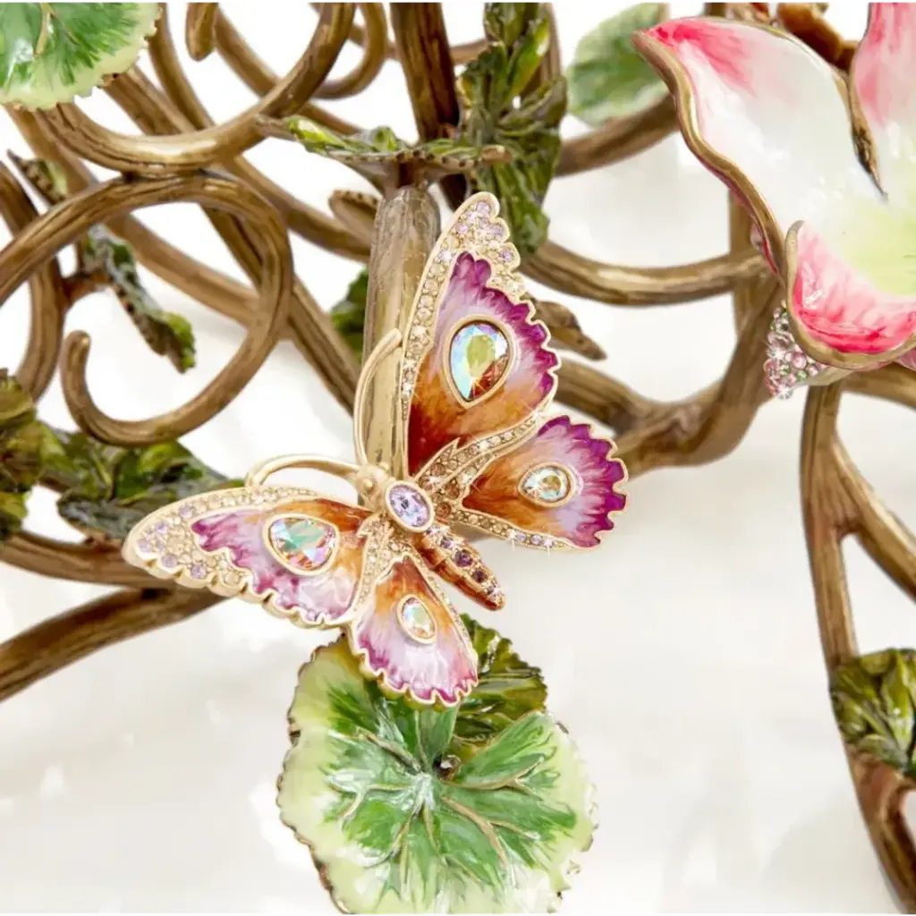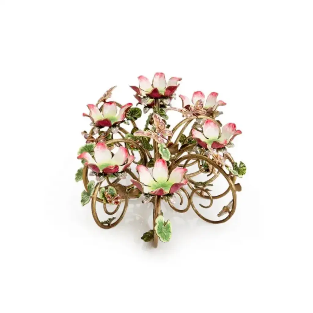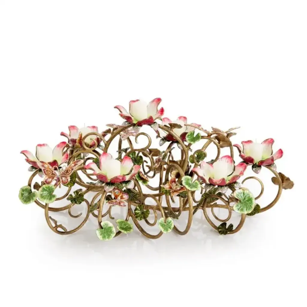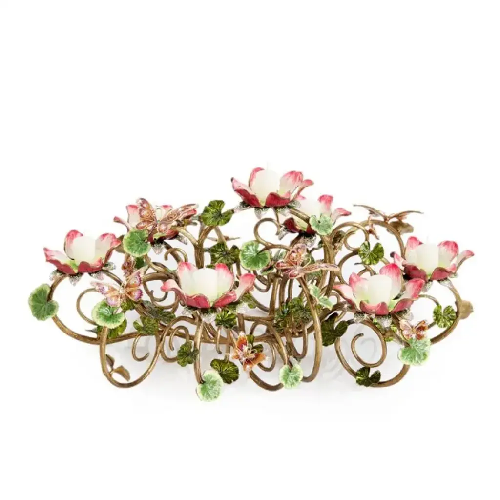Magnificent scrolls adorned with lily pads descend from picturesque blushing water lilies. Hand-formed brass scrolls intricately weave between an array of butterflies, flowers, and lily pads. Let your home come to life with our spectacular Claudine Floral & Butterfly Candelabra.