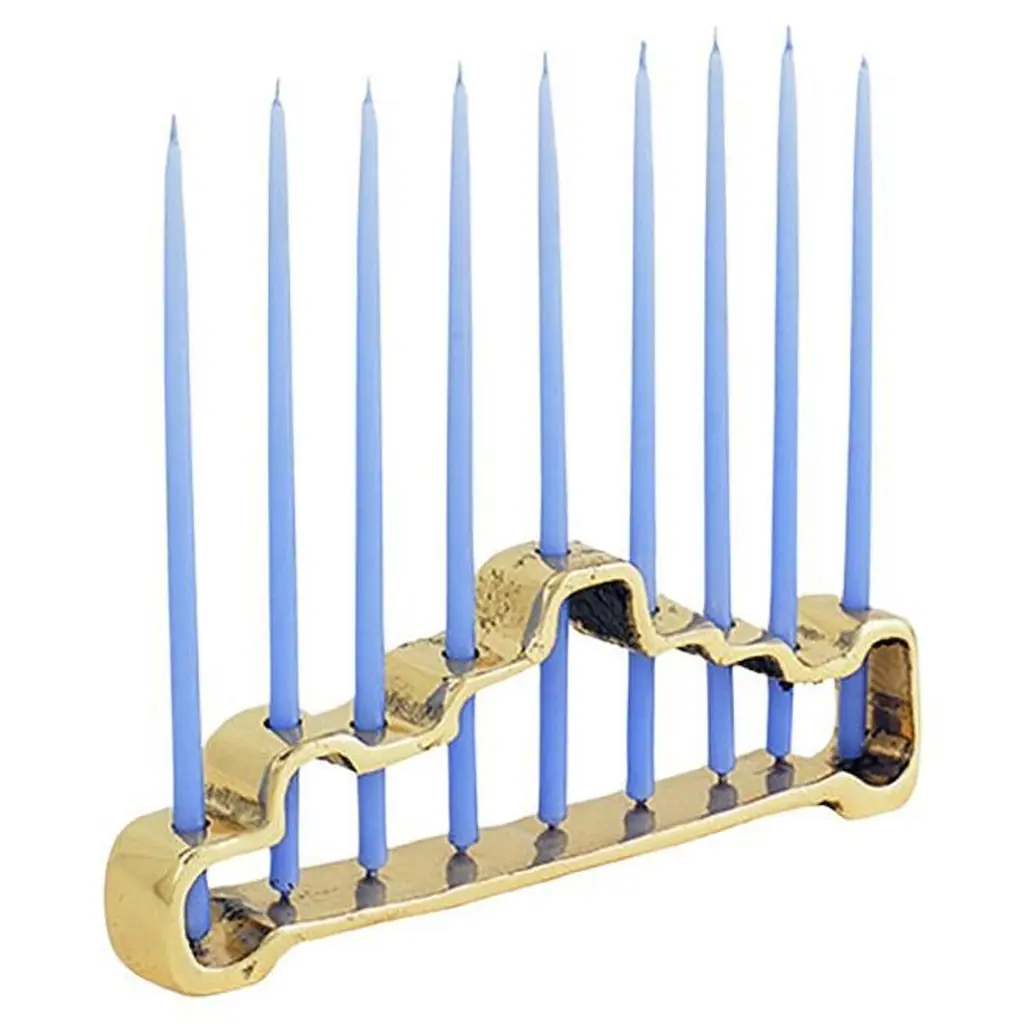 Eight Days of Shine. Mod and luminous, our mesmerizing Como Menorah pairs juicy, dimensional color with bold, Memphis-y geometrics. Hand-poured to create a unique marbleized finish, each piece is then polished to luminous perfection. Polished nickel candle holders add a hint of classic glamour. The luxe material and simple design lend to an abstract and avant-garde holiday display or give one as a gift to a stylish member of the tribe.