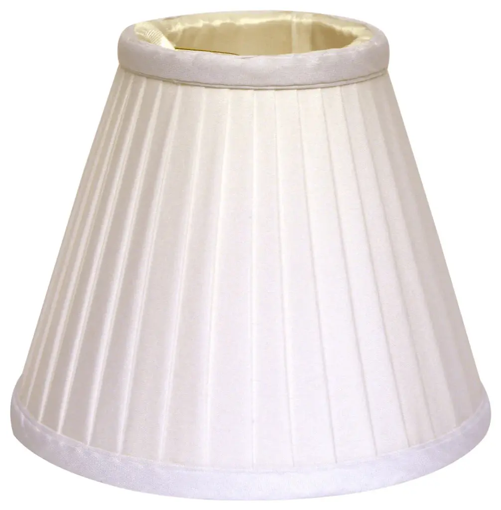 Why Upgrade to Home Concept Signature Shades? Top Quality Shantung Fabric means your room will glow with a rich, warm luster your guests will notice Thicker Fabric and heavy lining so your new shade will last for years. Heavy brass and steel frames mean you can feel the difference when you lift it. Why? Because your home is worth it! Product details: This empire shade has a cream thick fabric with vertical pleats. The pleats are more noticable when the light is on as the light illuminates between the pleats. Thick Silky Smooth Shantung Fabric 3 Top x 5 Bottom x 4 Slant Height Suggested maximum wattage for shade is 40 watt candelabra bulb