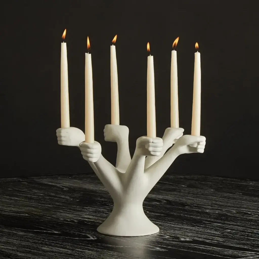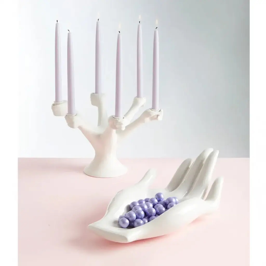A heavy dose of temptation to your next dinner party —our Eve-inspired riff on the neoclassical candelabra. Crafted from high-fired porcelain, six surreal hands rise up from the base to grip taper candles. Its generous scale and surreal presence rules a round table, or perch a pair on a long table for extra effect. Our Muse Collection substitutes our signature geometric relief patterns with body parts—faces, breasts, lips—to create a surreal style. Each piece is inspired by our favorite artists' muses.