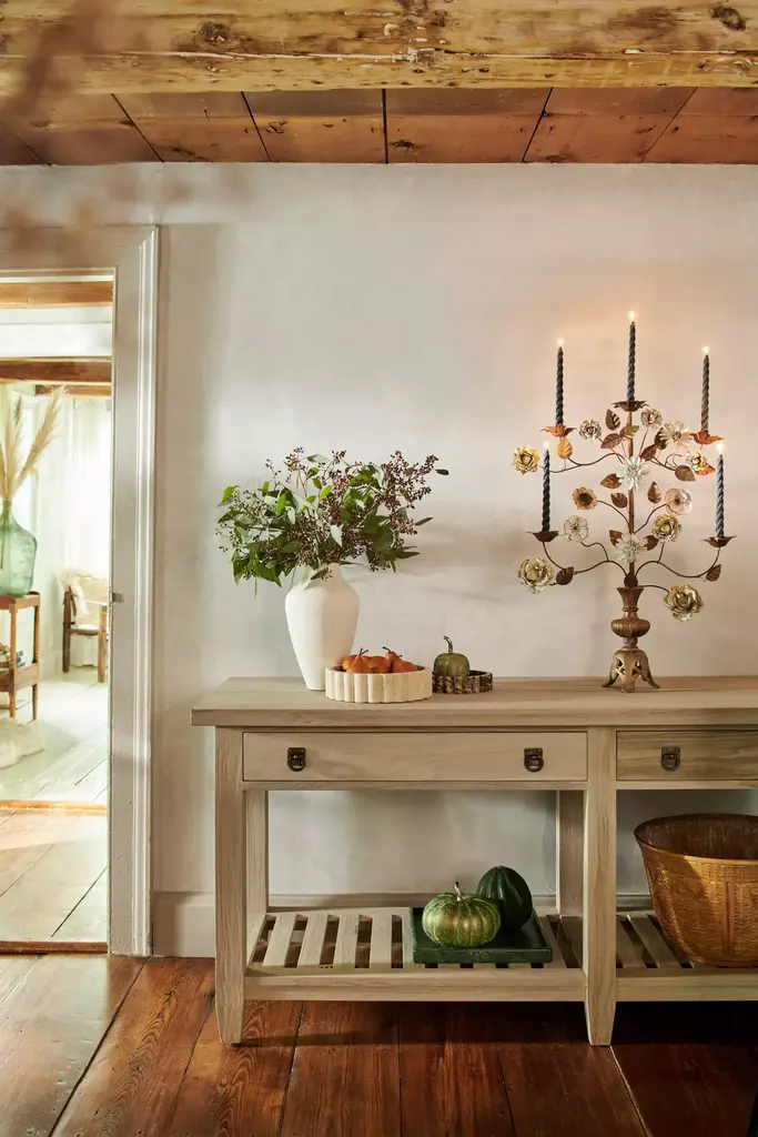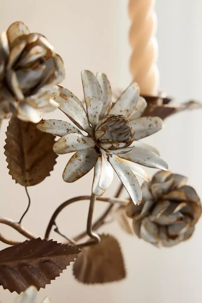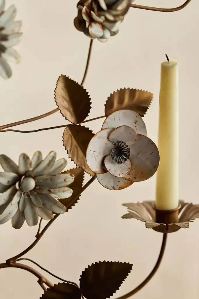 A stunning, exclusive terrain design, this brass candelabra is decorated with a garden of flower heads, ready to be shaped and positioned to create a unique, dramatic look on your table.