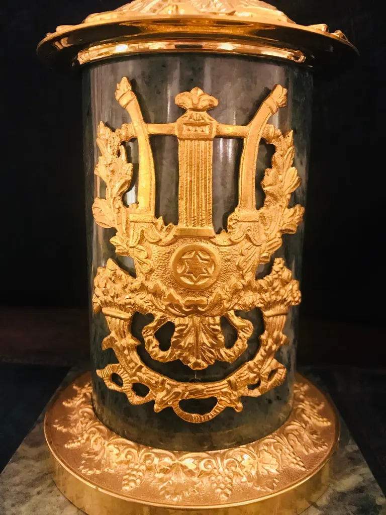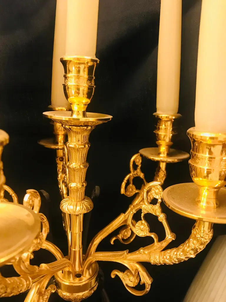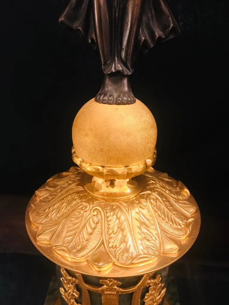 This Empire style gilt and burnished bronze candelabra by Gherardo Degli Albizzi, with its marble base, resume the great taste of Napoleon period decoration. Base is characterized by a columnar marble section, decorated with bronze applique over a round bronze ring decorated with grapes. Over it, the winged victory holds the six arms group. Their stems have got undulations and curls. Light configuration is characterized by five arms rounding the central one. This piece could be provided even with white shade and wiring. We could offer even great possibilities for customization, due to our selection of marbles and precious stones like malachite and lapis lazuli.