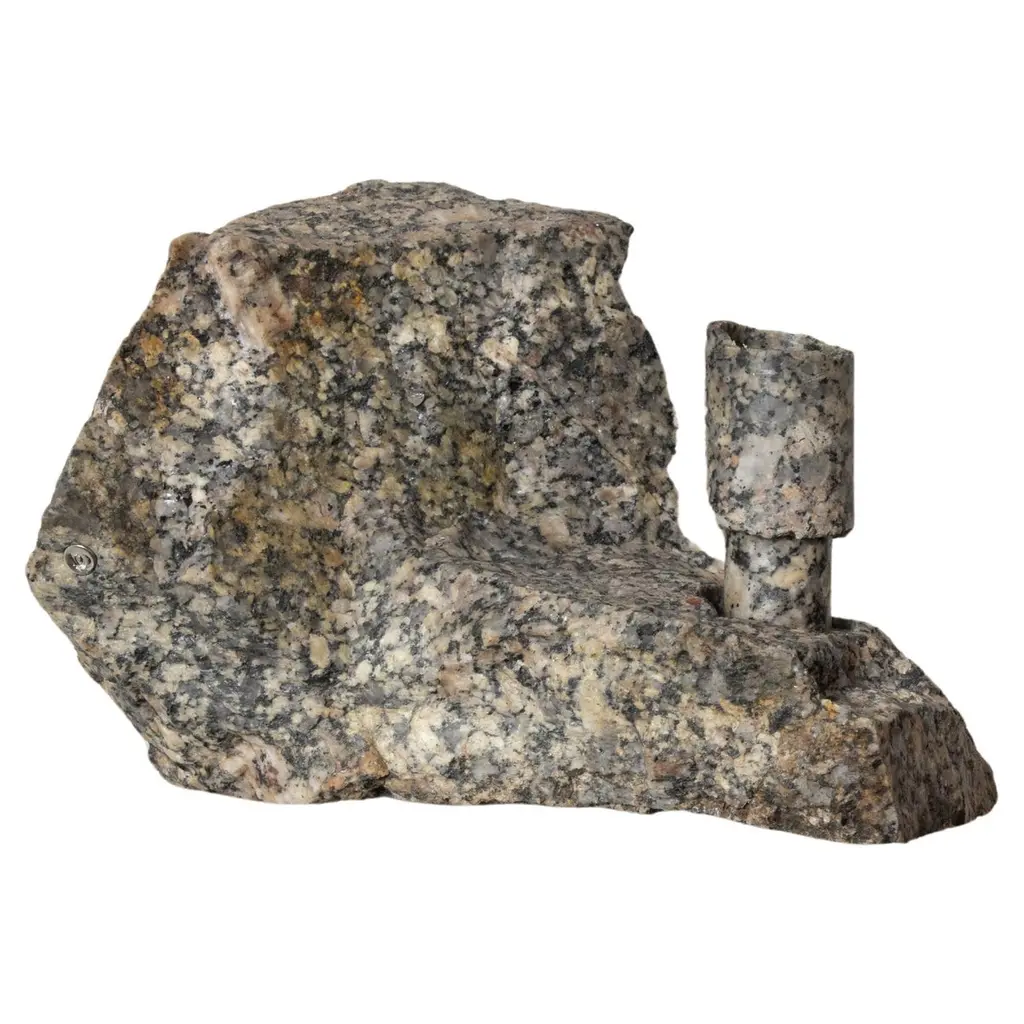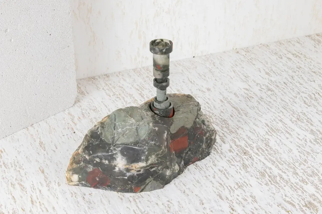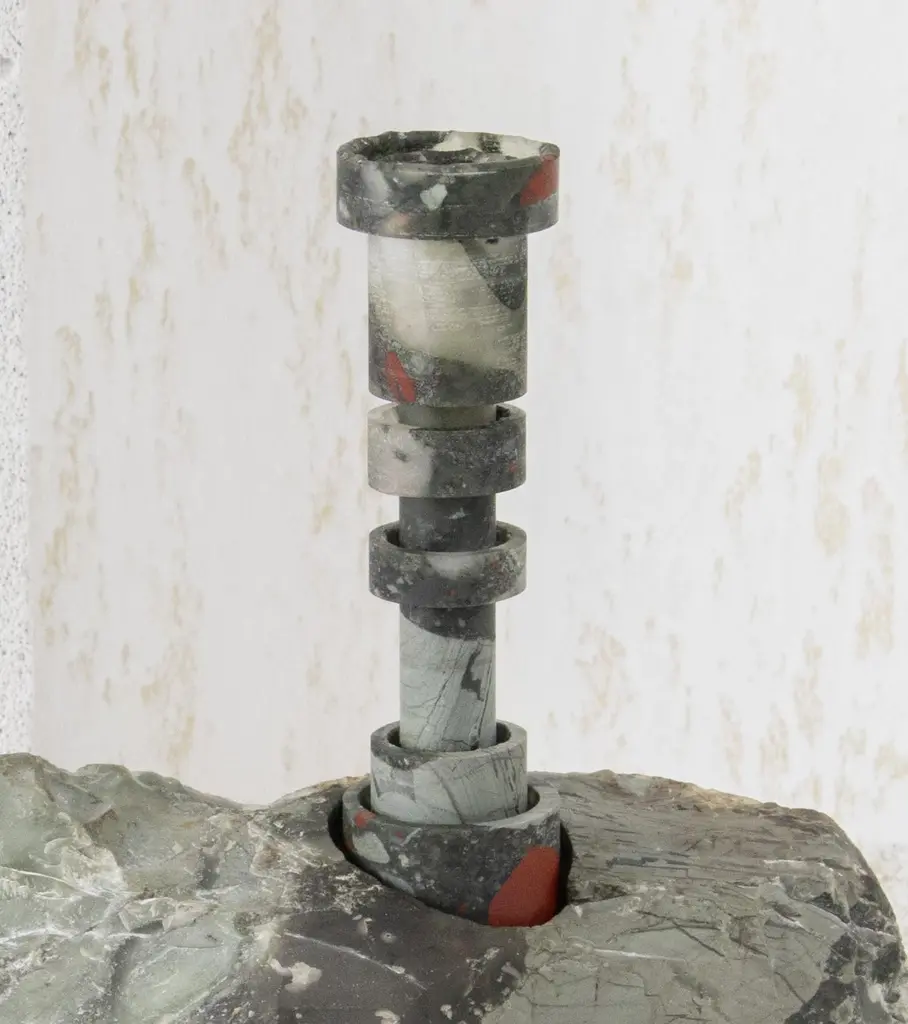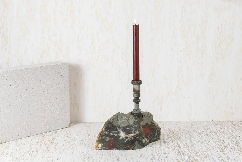 Heliotrope Seftonite Abra Candelabra by Studio DODimensions: D 25 x W 11 x H 20.5 cmMaterials: Heliotrope seftonite stone, copper.5 kg.Stone and fire are connected in an ageless bond. A sparkle created by clashing two stones with each other has been igniting fire over centuries. At the same time stones are used to safely border campfires. The warmth of the stone and intimate flame, reflect here on our interior environment. The classical shapes of candle holders are brought to light by extracting it from the core of a stone. Set in a 21st-century interpretation, it connects a timeless design type with a primitive appearing but contemporary driven technology.Based in Antwerp, Studio DO is a stone cutting atelier founded by Dana Seachuga and Octave Vandeweghe. These two creatives work independently: Dana as a jewellery maker and Octave as an artist. For Studio DO they joined forces and share their creative visions and expertise. Driven by their affection for stone cutting, they research the material and cultural role of (gem)stones within the realm of functional objects. Using basic interventions, shapes and aesthetics, they try to search for the minimal action necessary to give a rock a (traditional) function.Studio DO works on design projects and takes commissions related to stone, art, design objects and jewellery. Label & Labour stand along each other as one, becoming inseparable.
