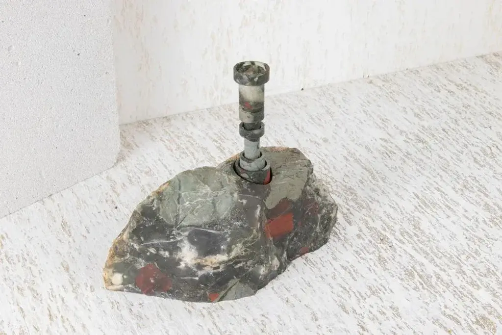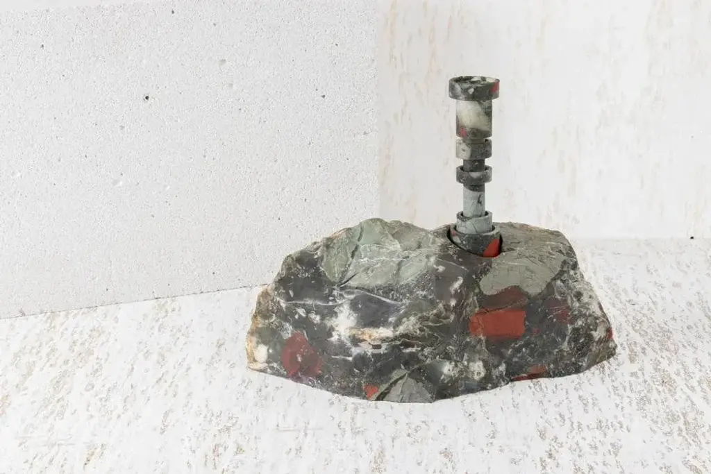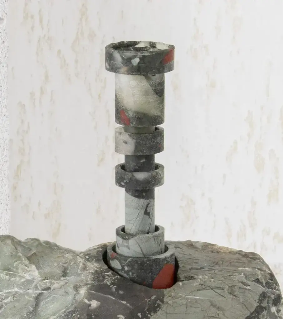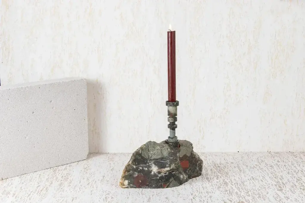 Heliotrope seftonite abra candelabra by studio do dimensions: d 25 x w 11 x h 20.5 cm materials: heliotrope seftonite stone, copper. 5 kg. Stone and fire are connected in an ageless bond. A sparkle created by clashing two stones with each other has been igniting fire over centuries. At the same time stones are used to safely border campfires. The warmth of the stone and intimate flame, reflect here on our interior environment. The classical shapes of candle holders are brought to light by extracting it from the core of a stone. Set in a 21st-century interpretation, it connects a timeless design type with a primitive appearing but contemporary driven technology. Based in antwerp, studio do is a stone cutting atelier founded by dana seachuga and octave vandeweghe. These two creatives work independently: dana as a jewellery maker and octave as an artist. For studio do they joined forces and share their creative visions and expertise. Driven by their affection for stone cutting, they research the material and cultural role of (gem)stones within the realm of functional objects. Using basic interventions, shapes and aesthetics, they try to search for the minimal action necessary to give a rock a (traditional) function. Studio do works on design projects and takes commissions related to stone, art, design objects and jewellery. Label & labour stand along each other as one, becoming inseparable.