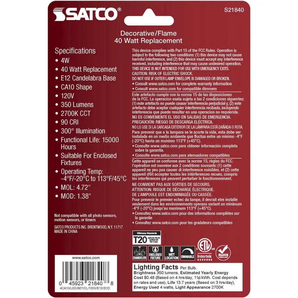 4-Watt CA10 LED - Clear - Candelabra Base - 2700K - 350 Lumens - 120 Volts - 2-Pack