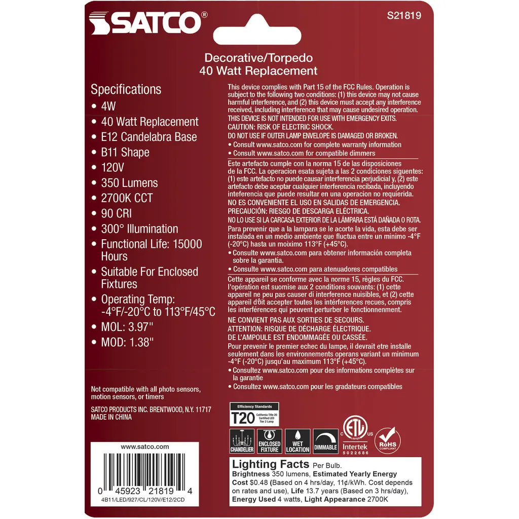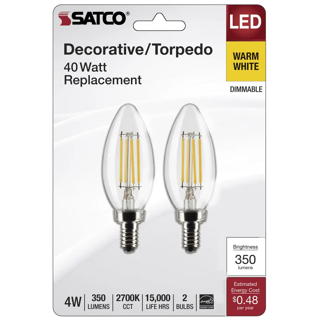 4-Watt B11 LED - Clear - Candelabra Base - 2700K - 350 Lumens - 120 Volts - 2-Pack