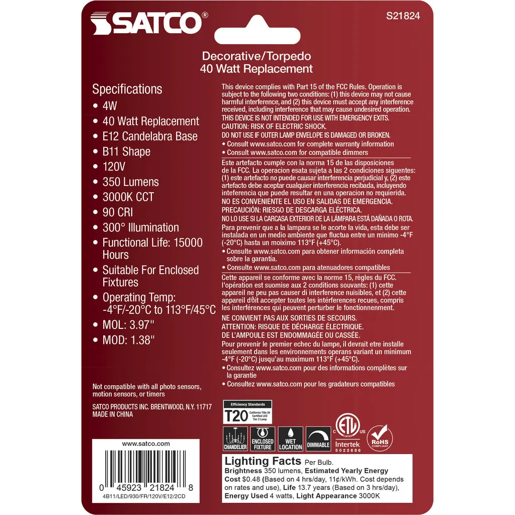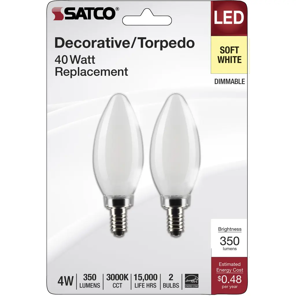 4-Watt B11 LED - Frosted - Candelabra Base - 3000K - 350 Lumens - 120 Volts - 2-Pack