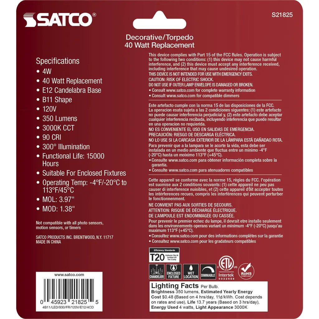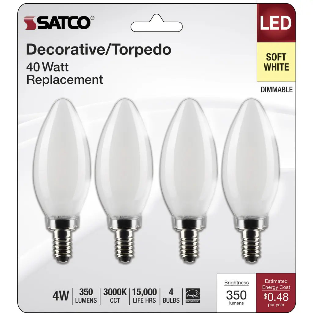 4-Watt B11 LED - Frosted - Candelabra Base - 3000K - 350 Lumens - 120 Volts - 4-Pack